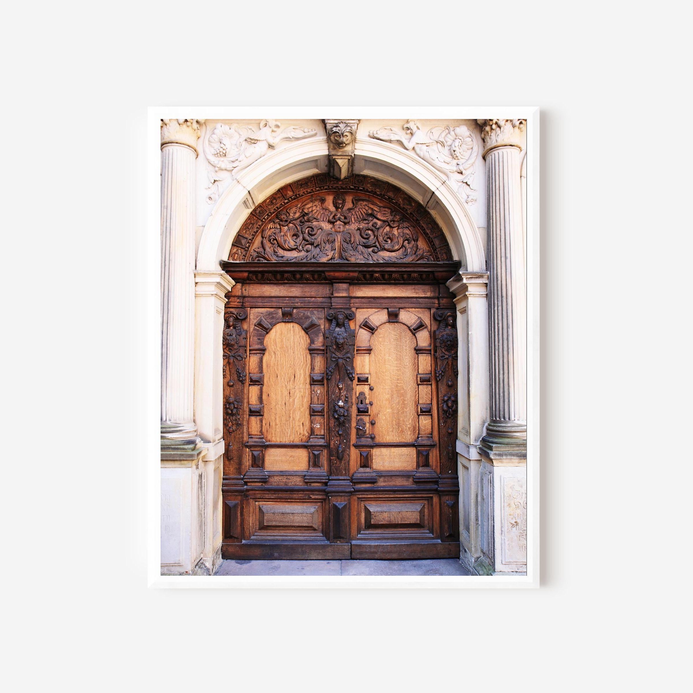 This architectural photograph features a richly carved wooden door set within classical stonework in Helsingør, a town known for its literary and historic legacy. Warm wood tones and sculptural detail contrast softly with pale stone, creating a composition that feels grounded, balanced, and enduring.