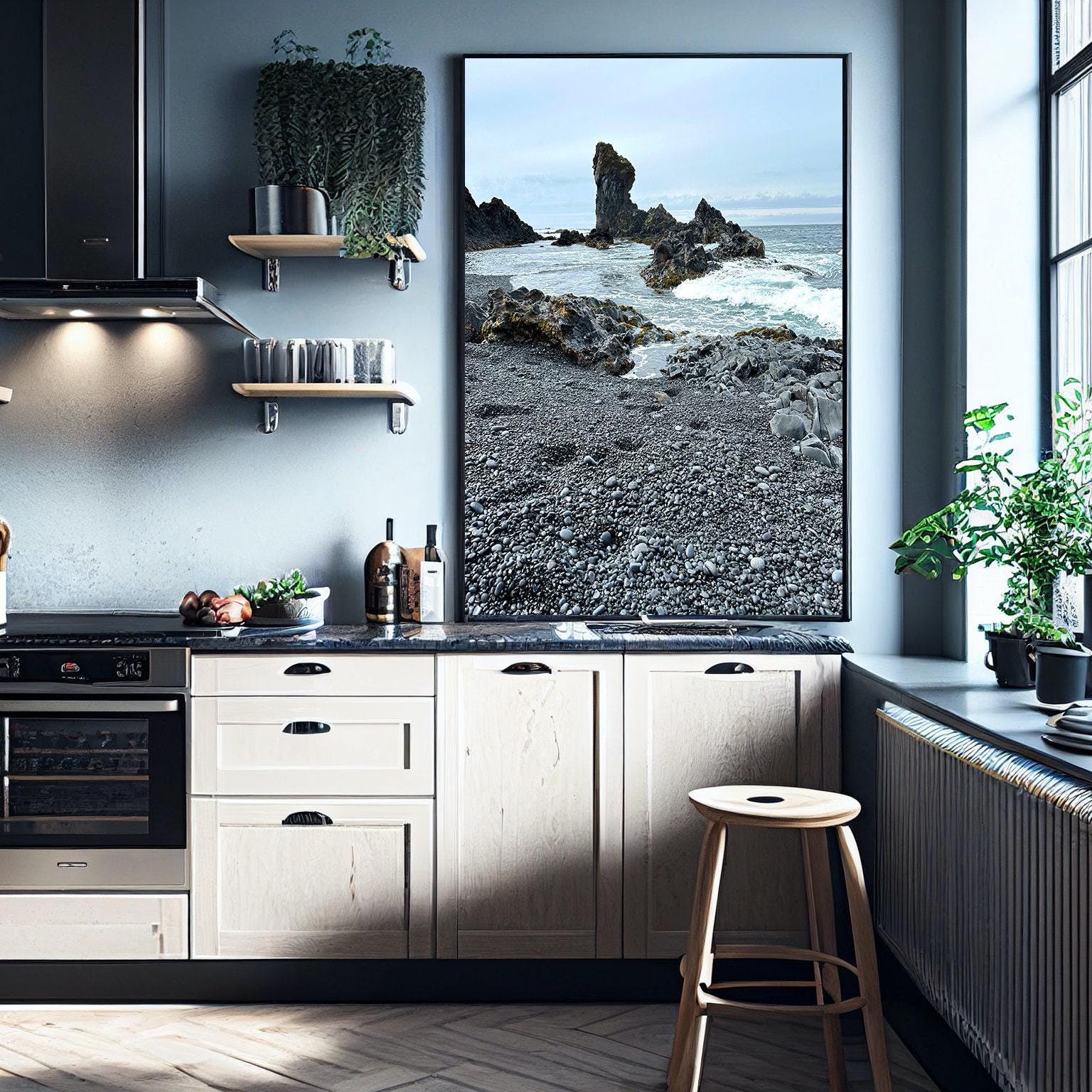 Pair this print with limewashed white or soft gray walls, warm oak or walnut furniture, and woven wool or linen textiles. A matte white frame keeps it clean and gallery-like; a thin black frame leans into its volcanic edge.