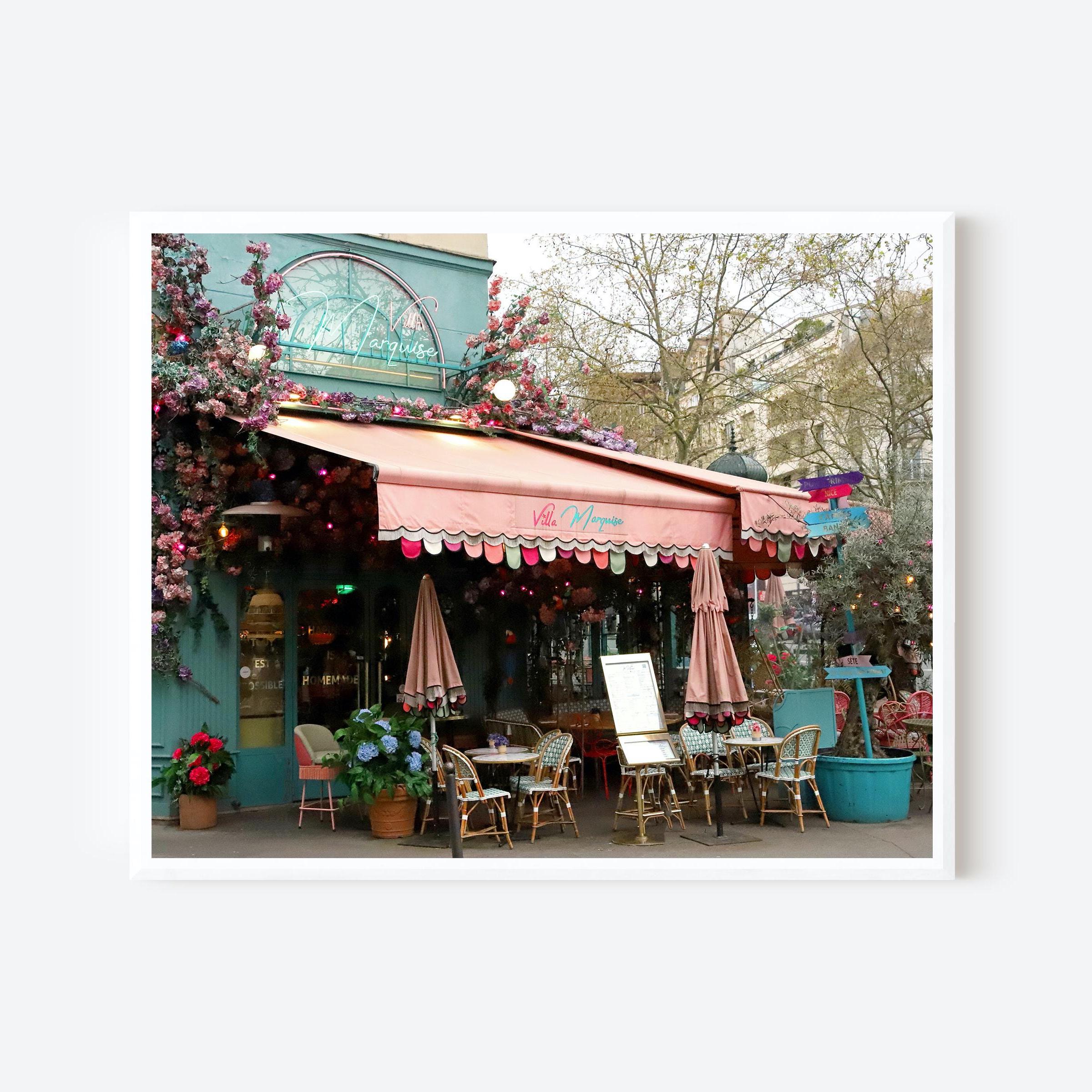 Brighten up your home with this charming Paris photography print of a beautiful floral cafe. The vibrant, colorful blooming flowers and cozy bistro tables and chairs on the sidewalk will transport you to the charming streets of the 6th arrondissement. Perfect for adding a touch of Parisian aesthetic to your kitchen or dining room. Original photography by Vita Nostra.