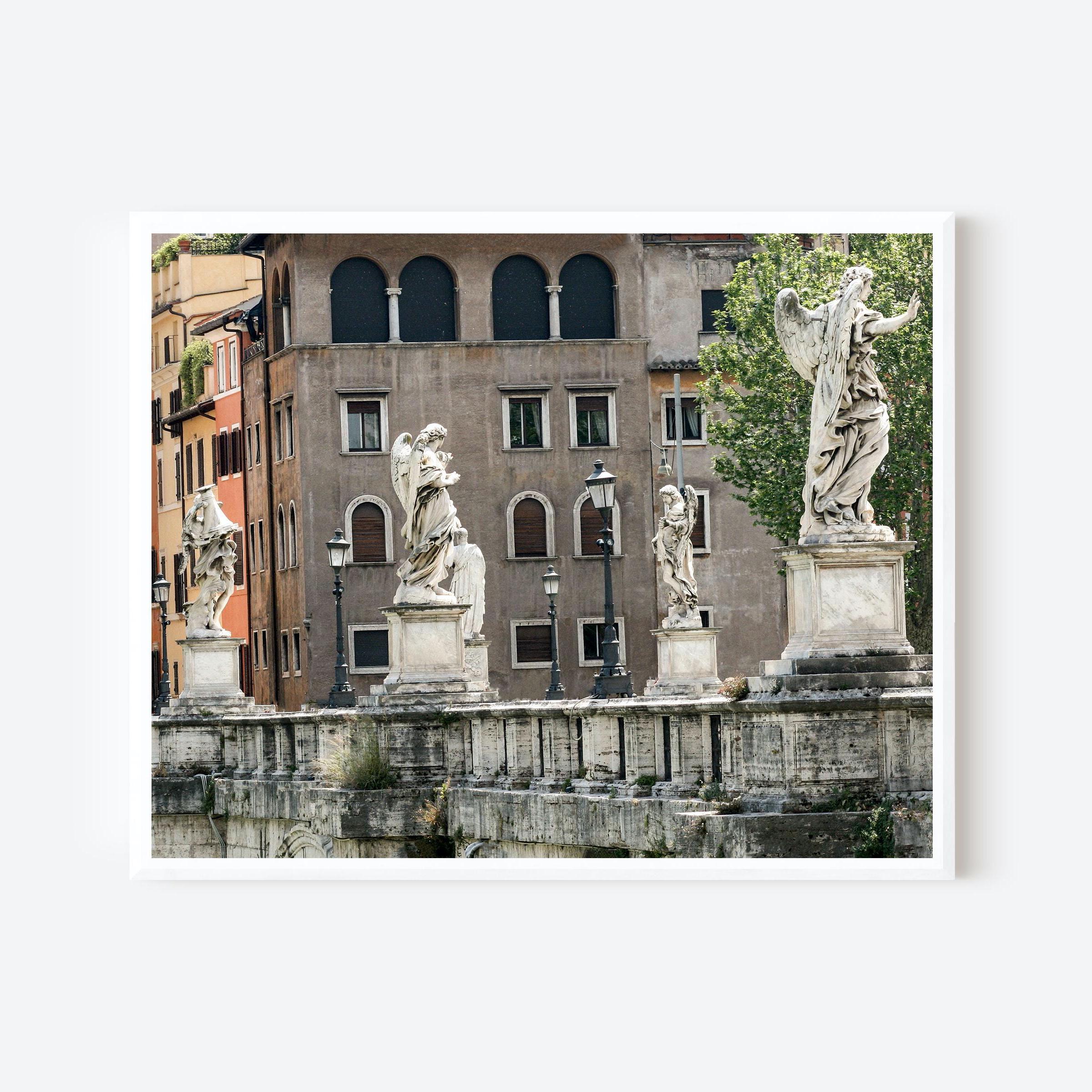 On Rome’s Ponte Sant’Angelo, a procession of marble angels stands watch over the centuries. This classic Italian photography print captures their enduring stillness, sculpted forms glowing against soft light and warm terracotta façades.