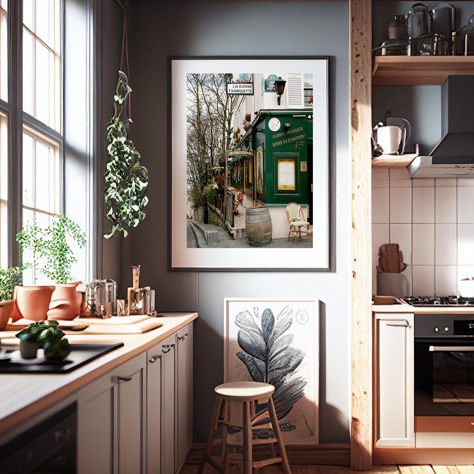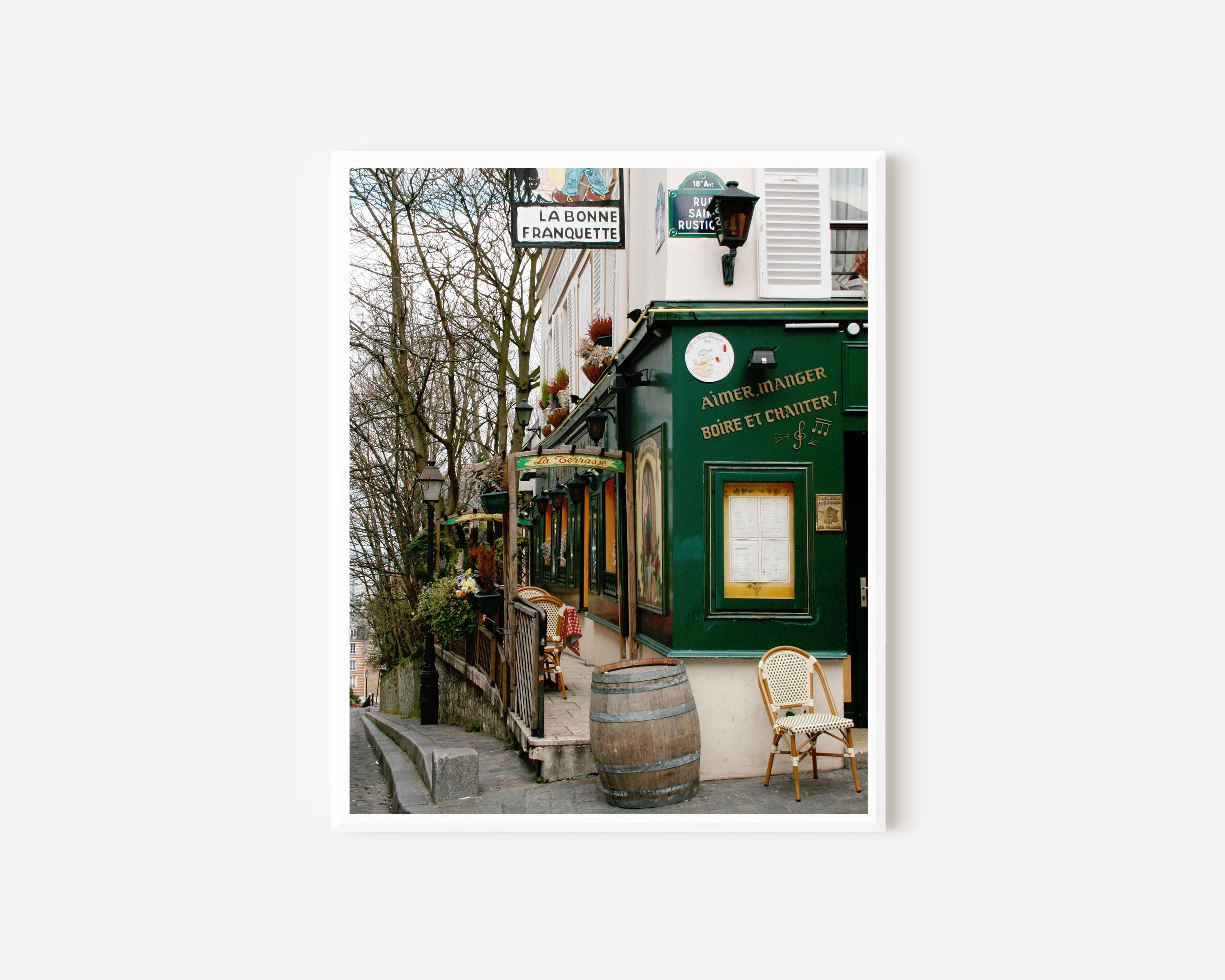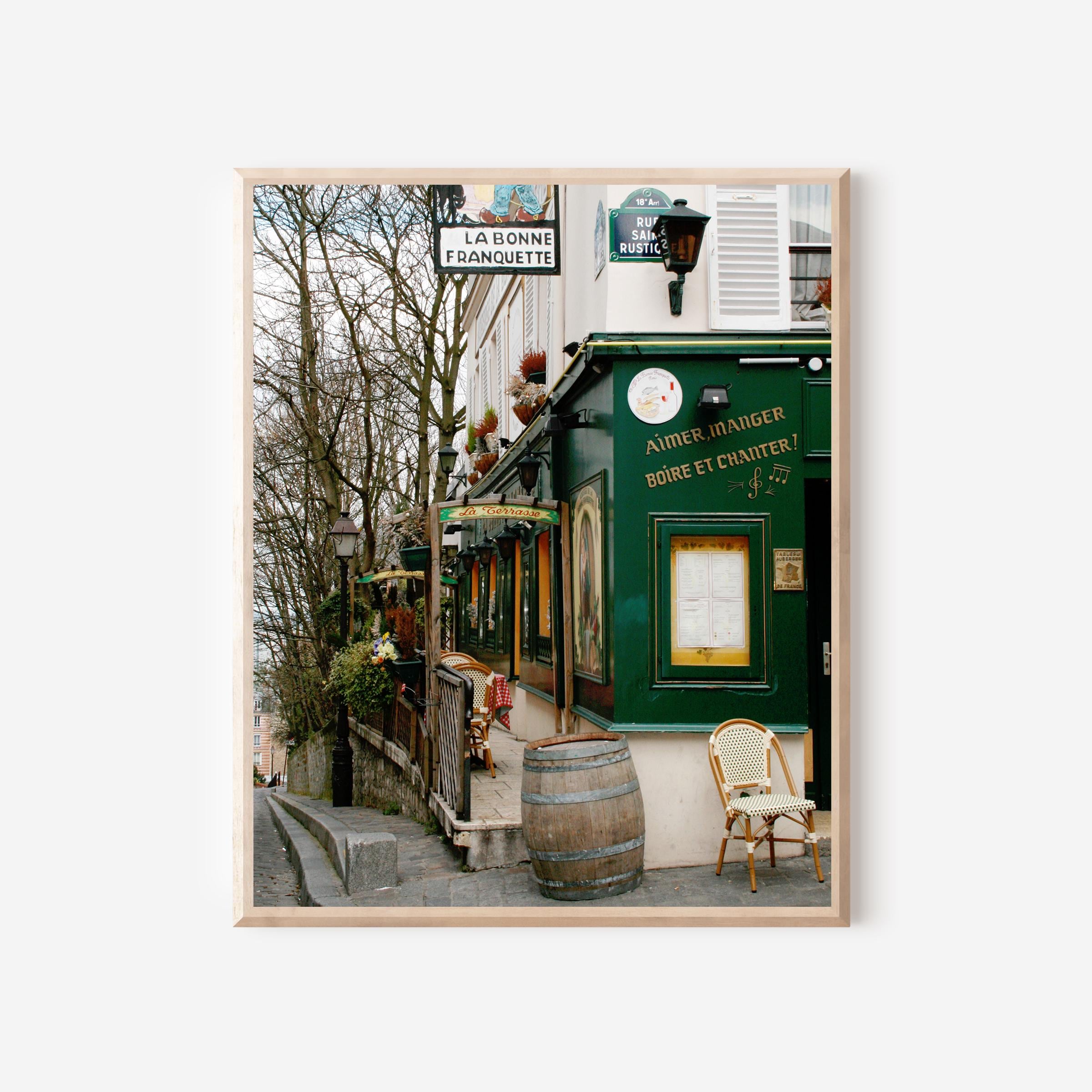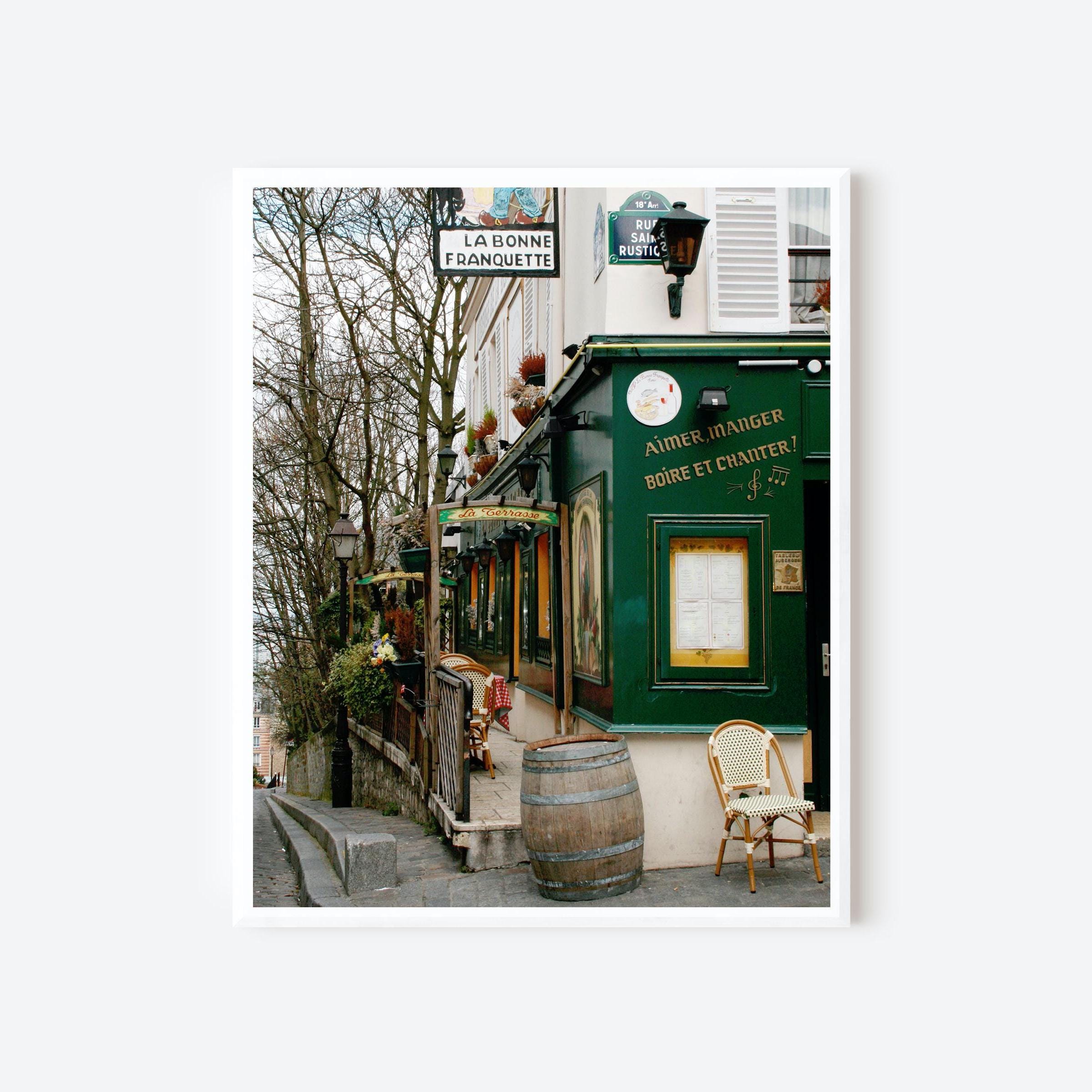 Add a touch of Parisian charm to your home with our Paris Cafe Print. Featuring the famous La Bonne Franquette restaurant in historic Montmartre, this photograph captures the essence of love, food, and art in one place. With rich emerald green and warm tones, it adds romance and elegance to any space. Personalize it with a mat or frame to make it your own.
