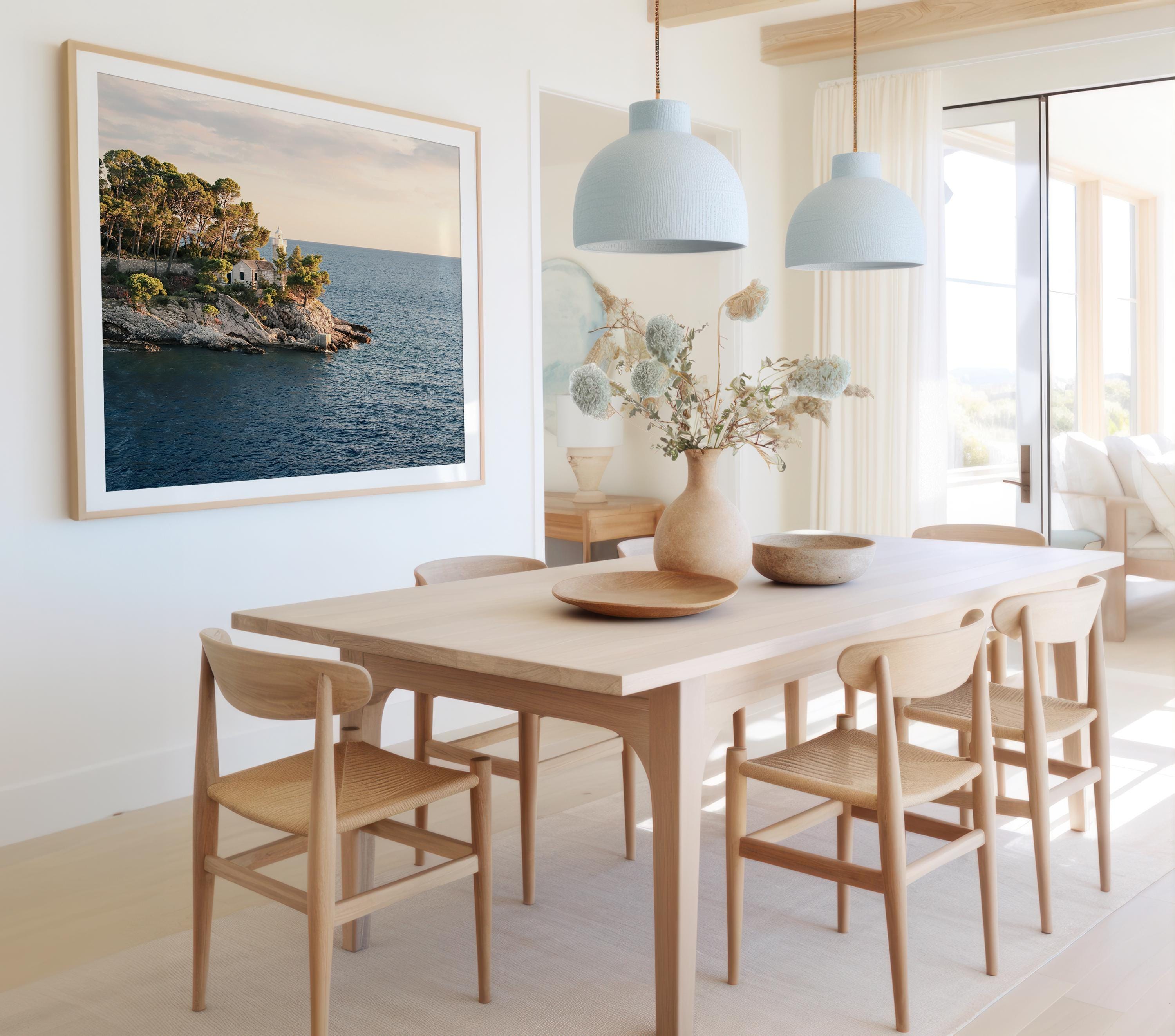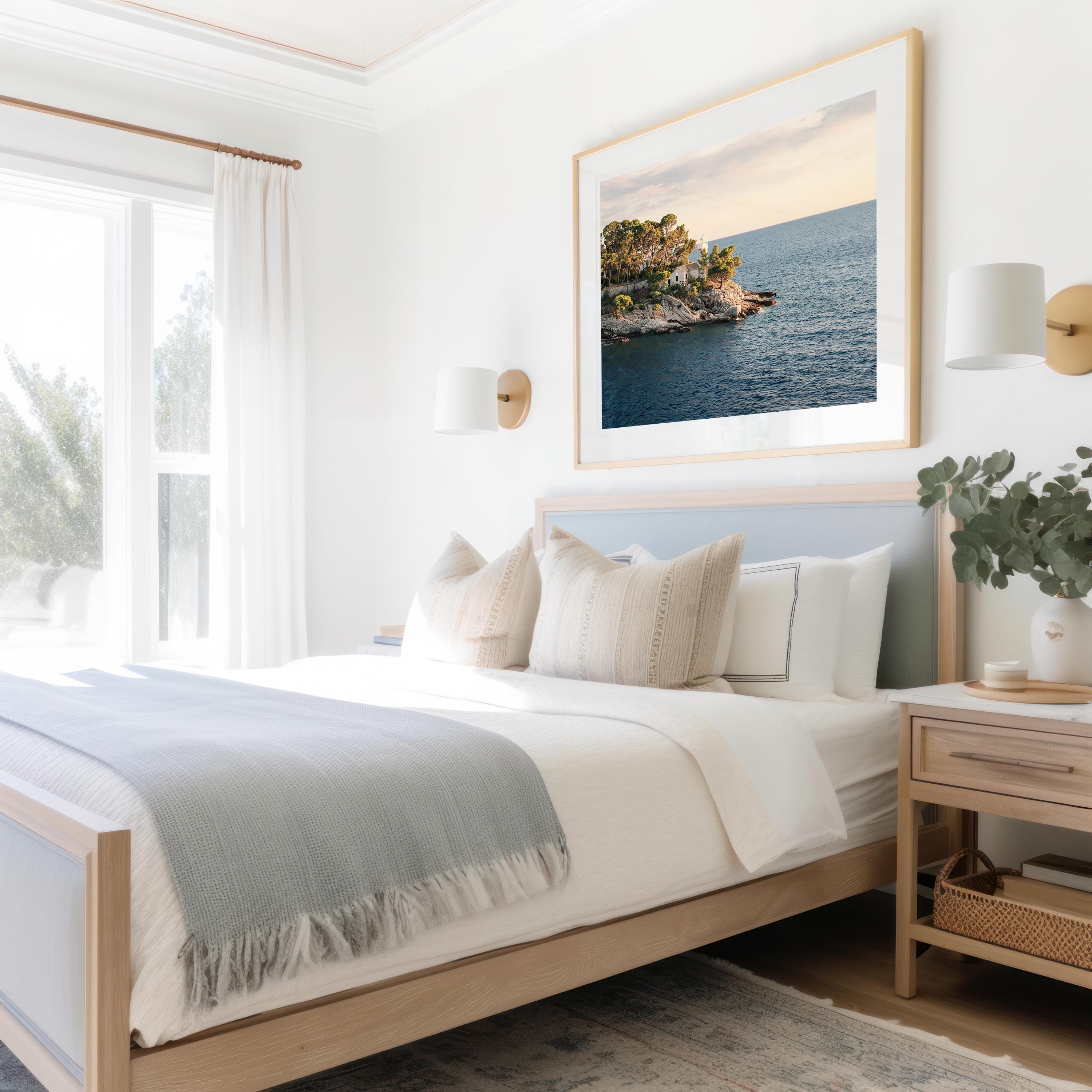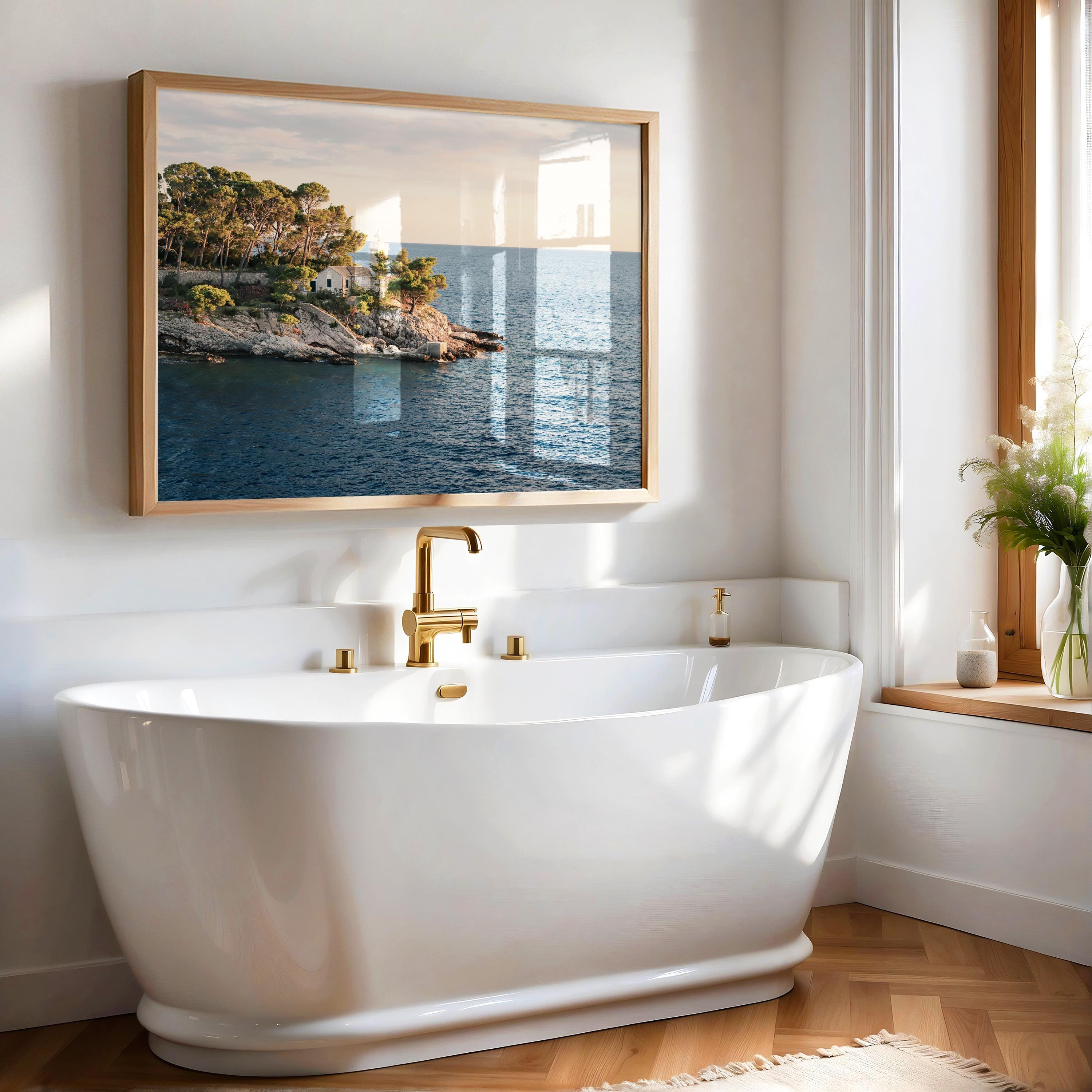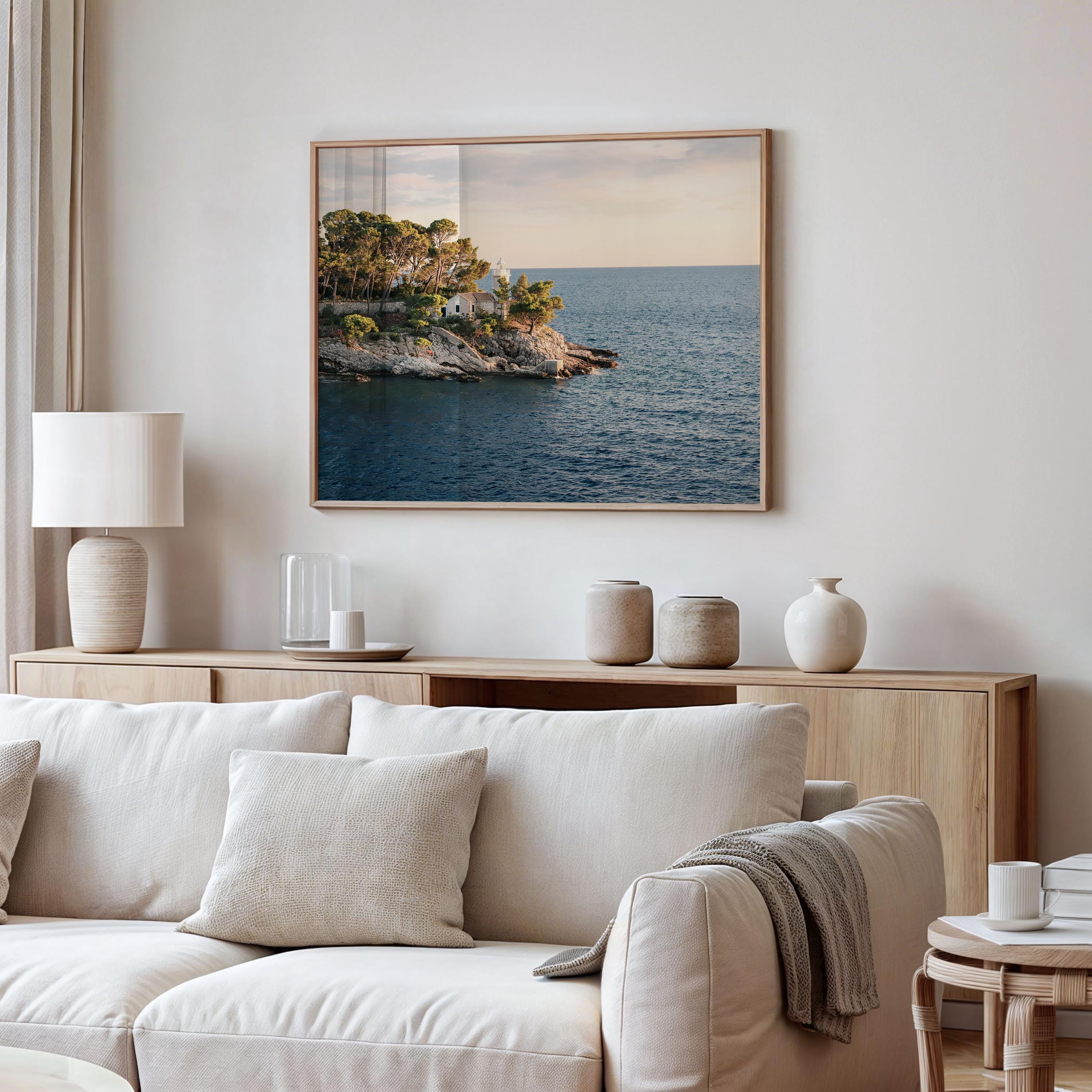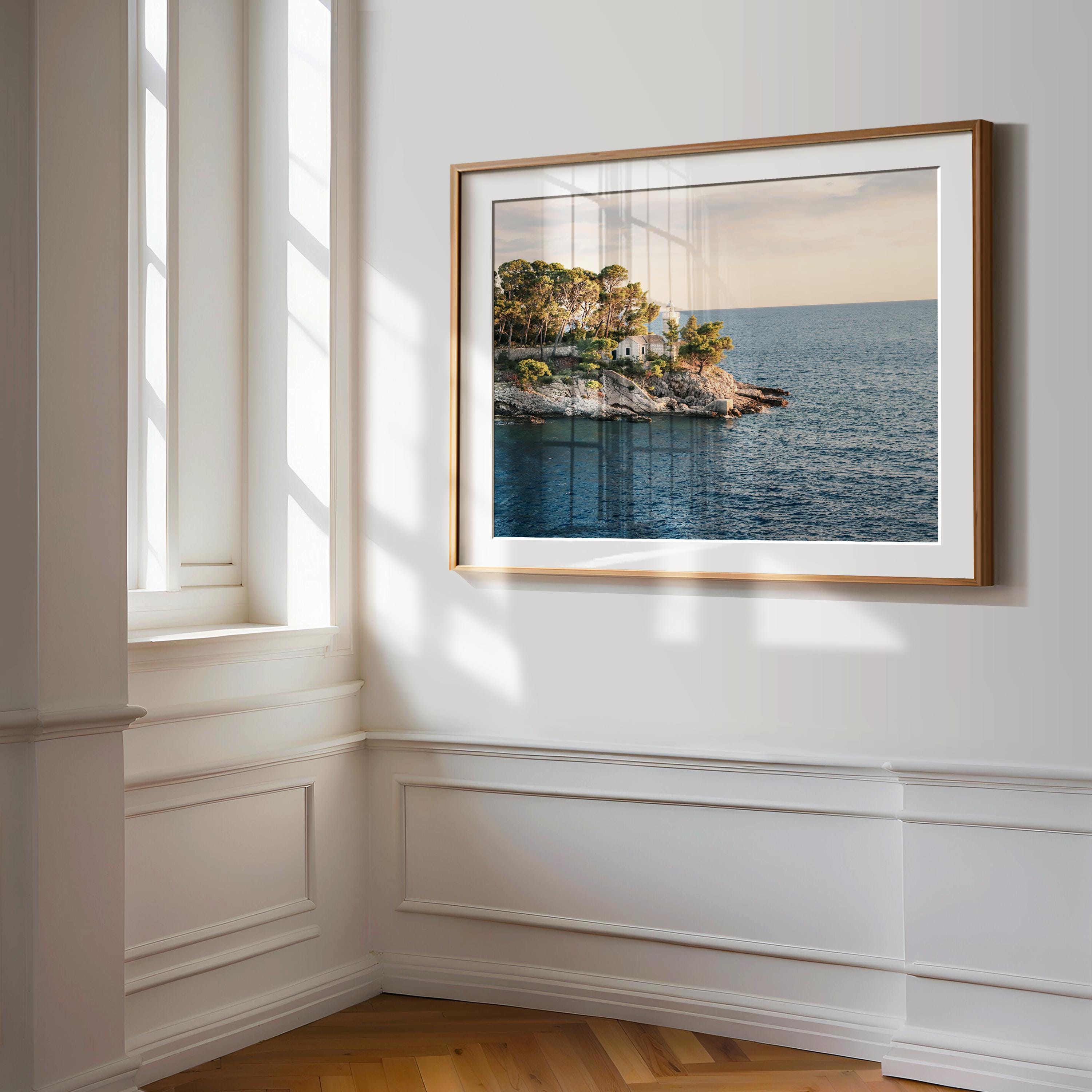 This print complements neutral, layered interiors - modern coastal homes, European-inspired spaces, or minimalist rooms that embrace warmth and texture. Pair it with light oak frames, linen fabrics, and natural materials for a curated Mediterranean feel. Its tranquil composition invites a sense of calm, making it equally striking above a console, in a bedroom retreat, or within a coastal gallery wall.