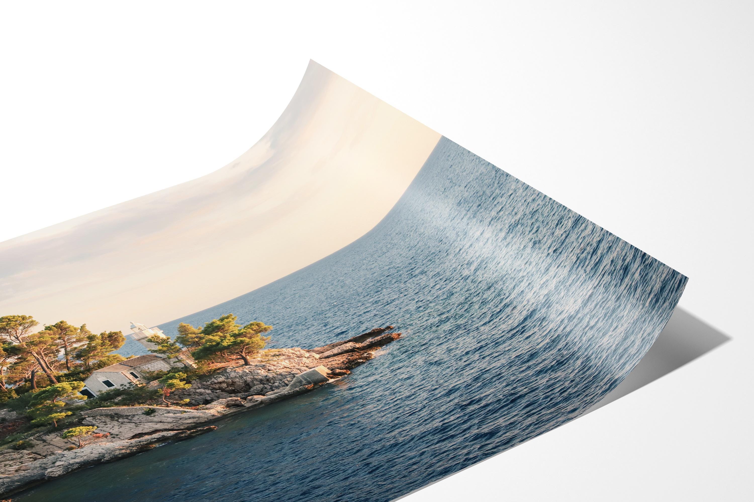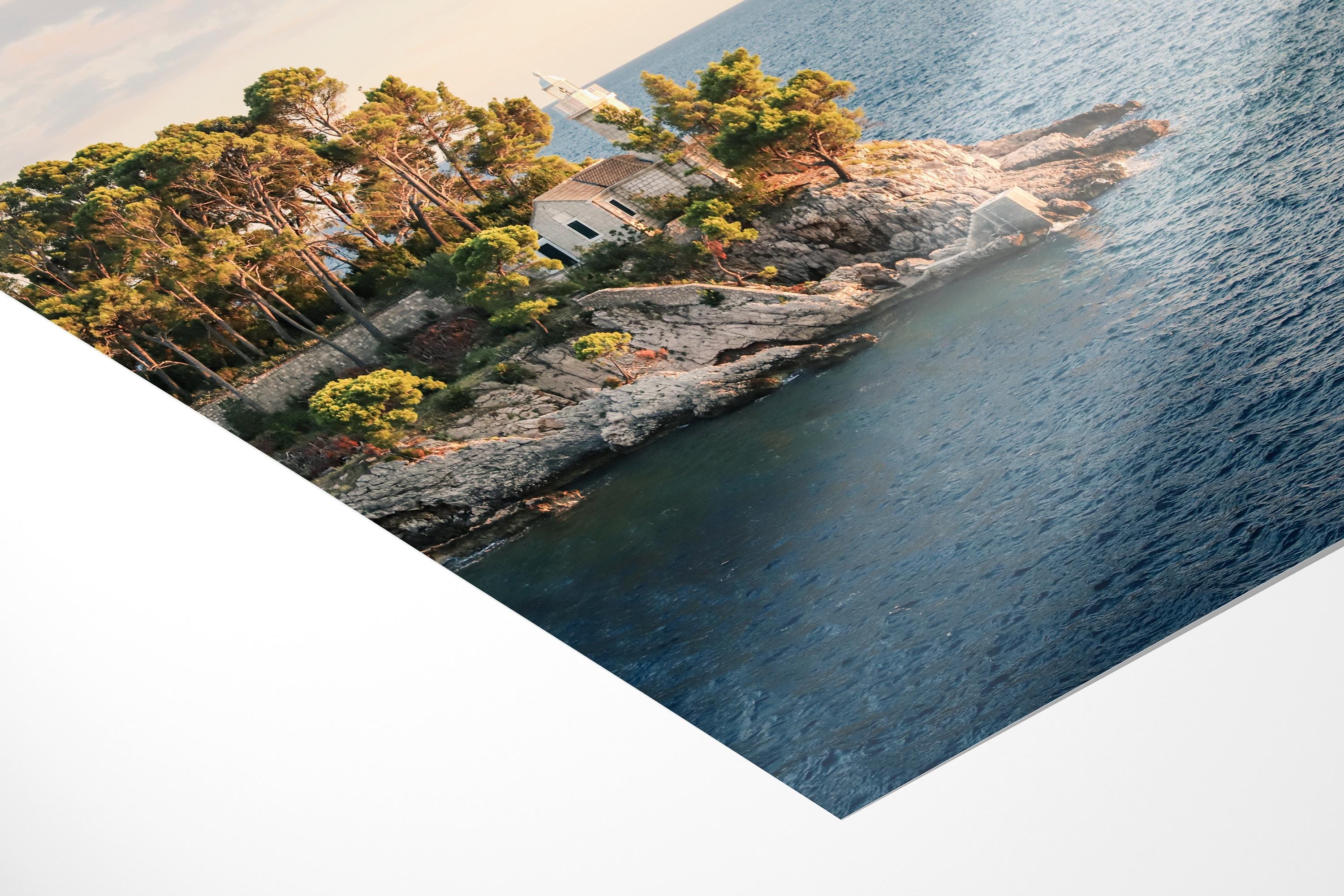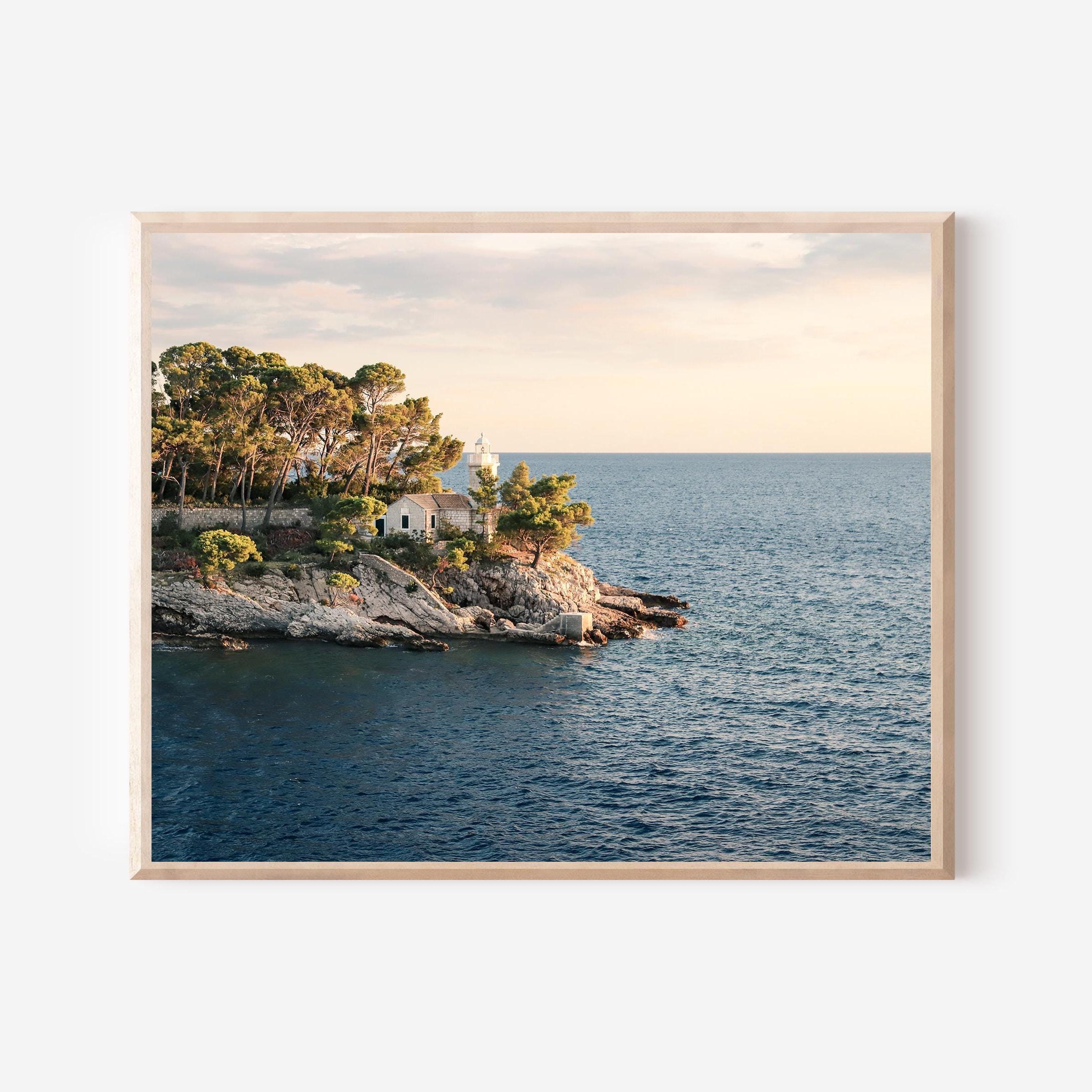 Soft golden light drapes over Lokrum Island’s historic lighthouse just off Dubrovnik’s coast where pines, limestone, and sea meet in quiet balance. The original photography print captures the timeless elegance of the Adriatic, blending architecture and nature with refined simplicity.