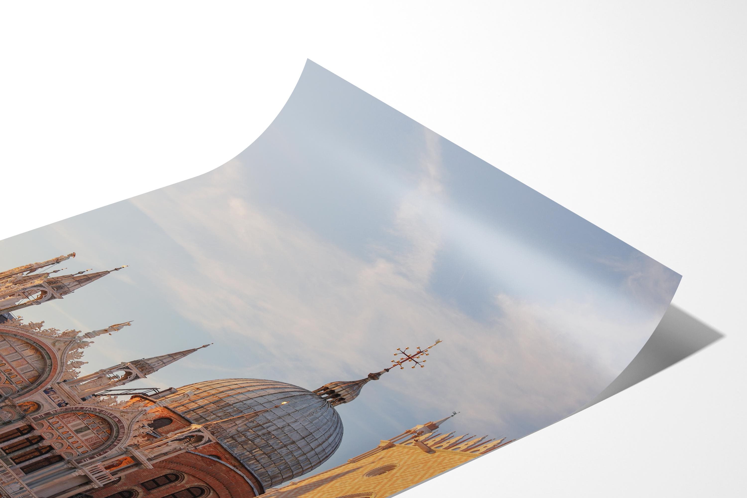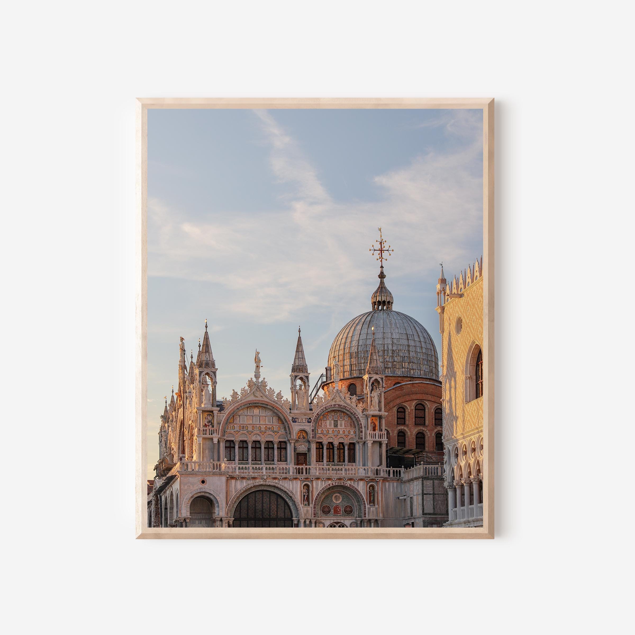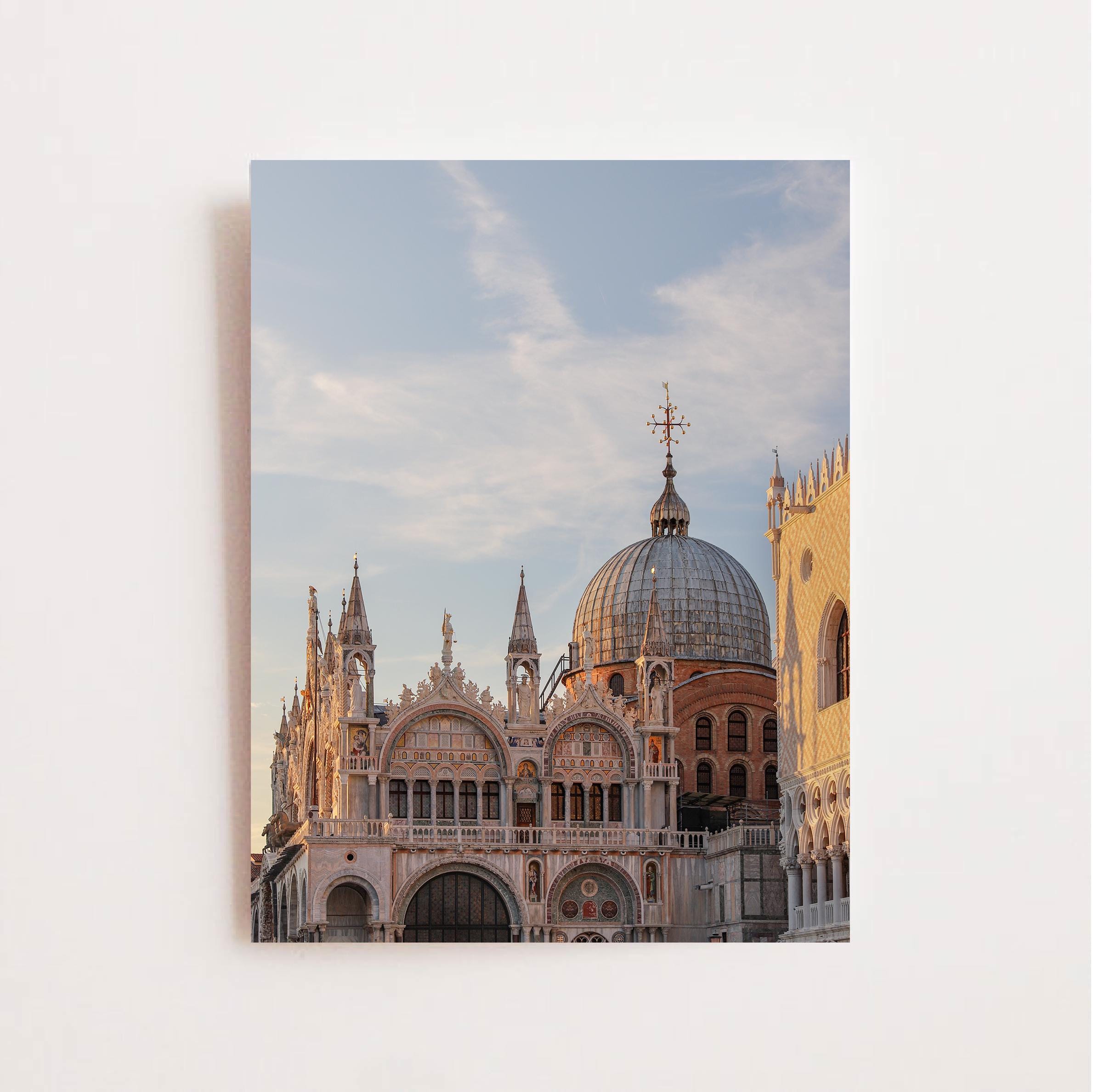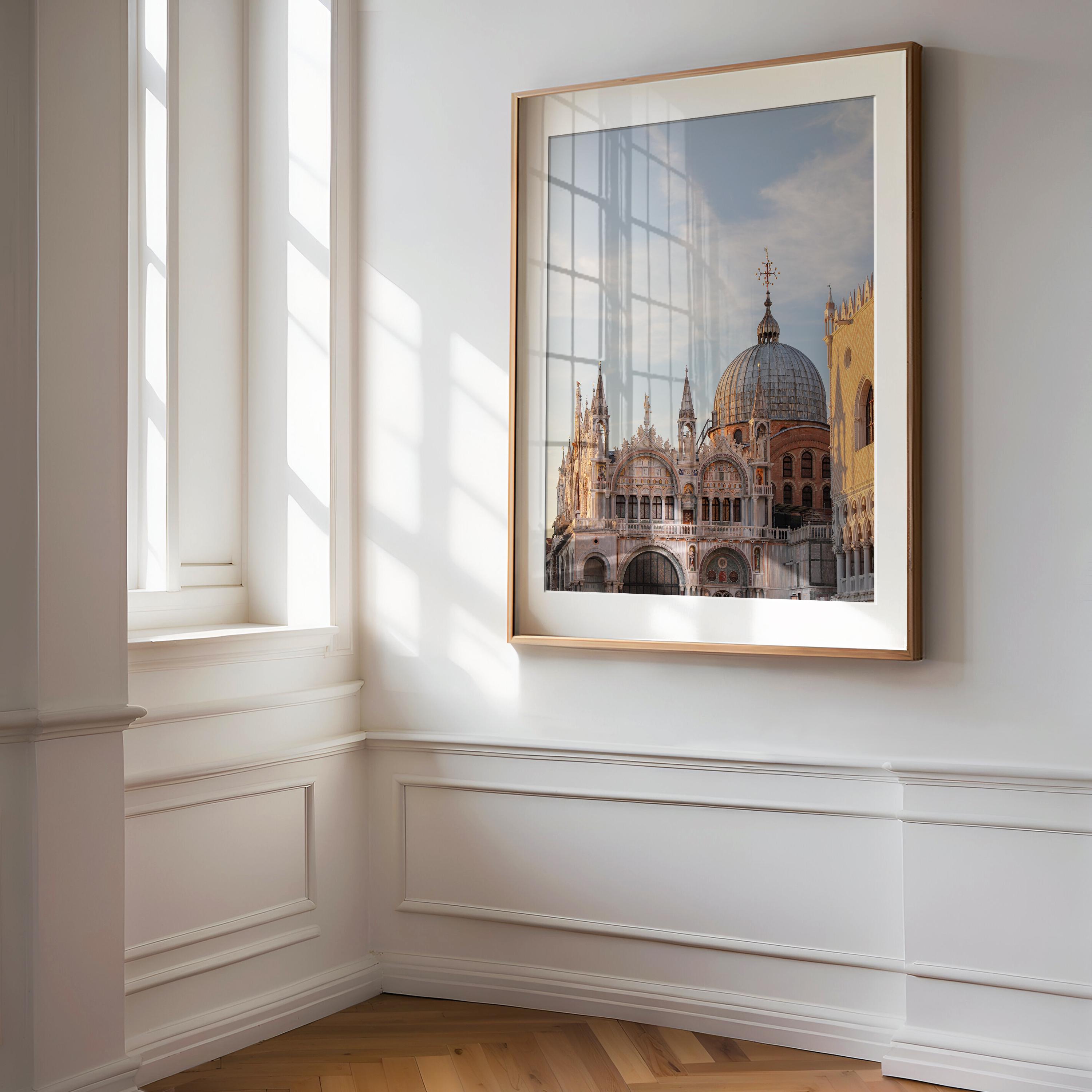 Venice glows at golden hour, and the Basilica di San Marco becomes a study in soft light and timeless detail. This photograph captures the warmth, texture, and quiet elegance of the basilica’s façade — an architectural moment grounded in history and refined for modern interiors. Styled with warm neutrals or natural wood, it brings depth and a sense of European artistry to any room.