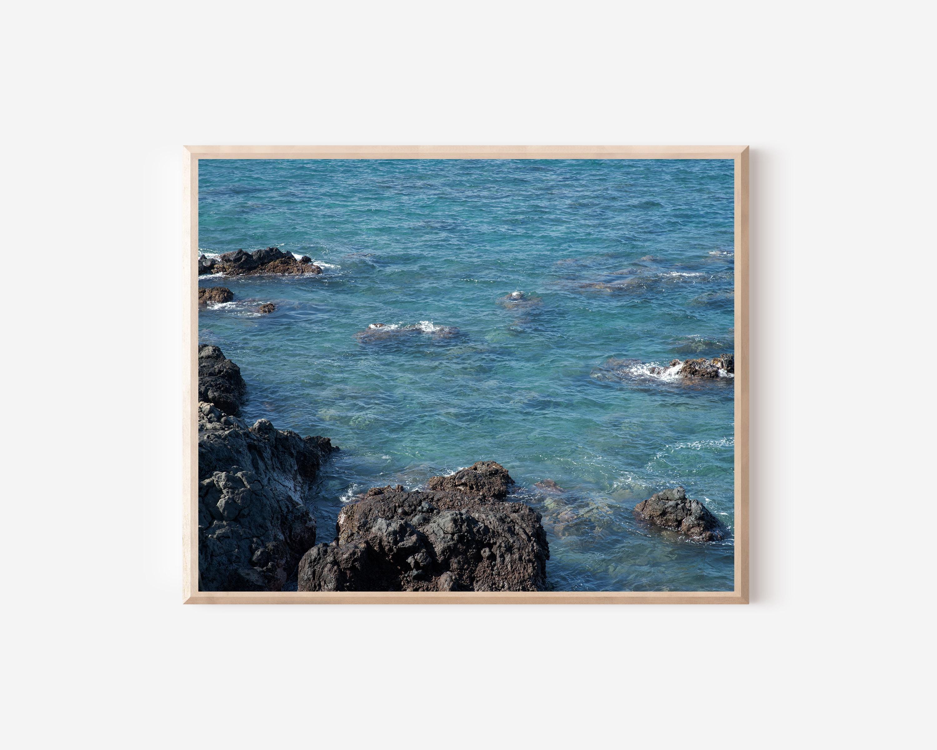 This Maui shoreline composition focuses on the quiet interplay between water and volcanic rock—where movement meets structure. The layered blues shift gently across the frame, while the darker stone anchors the image with subtle weight and texture.