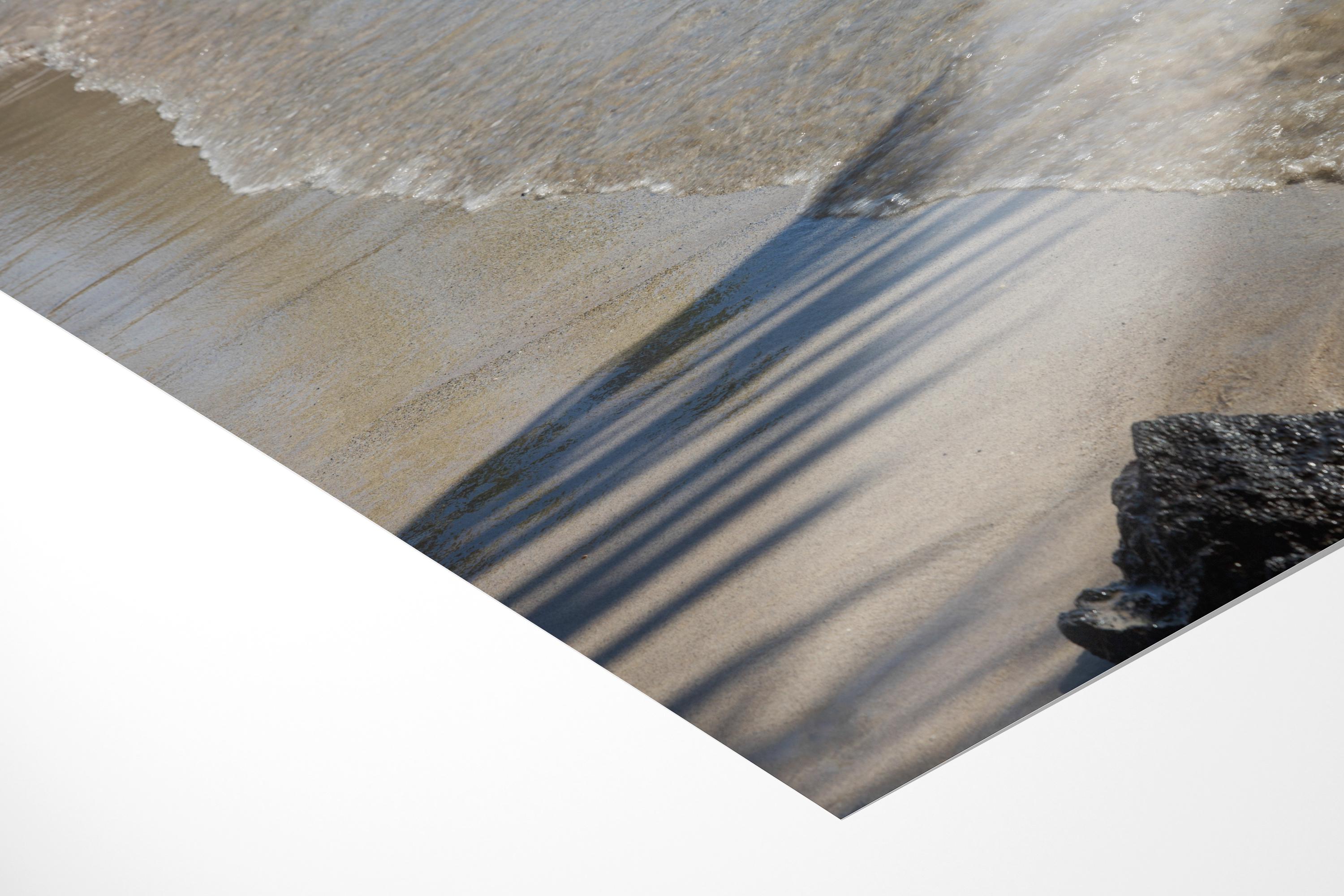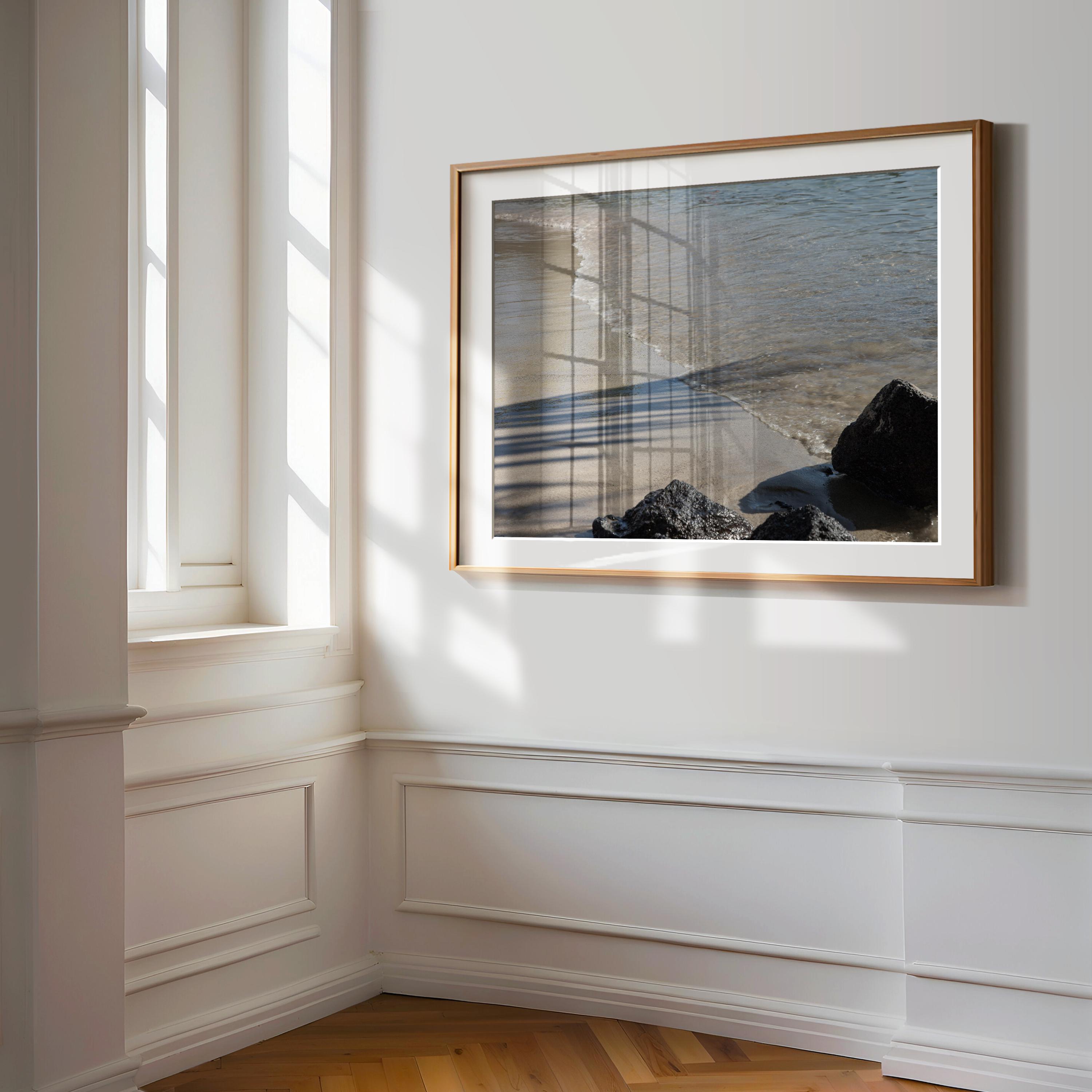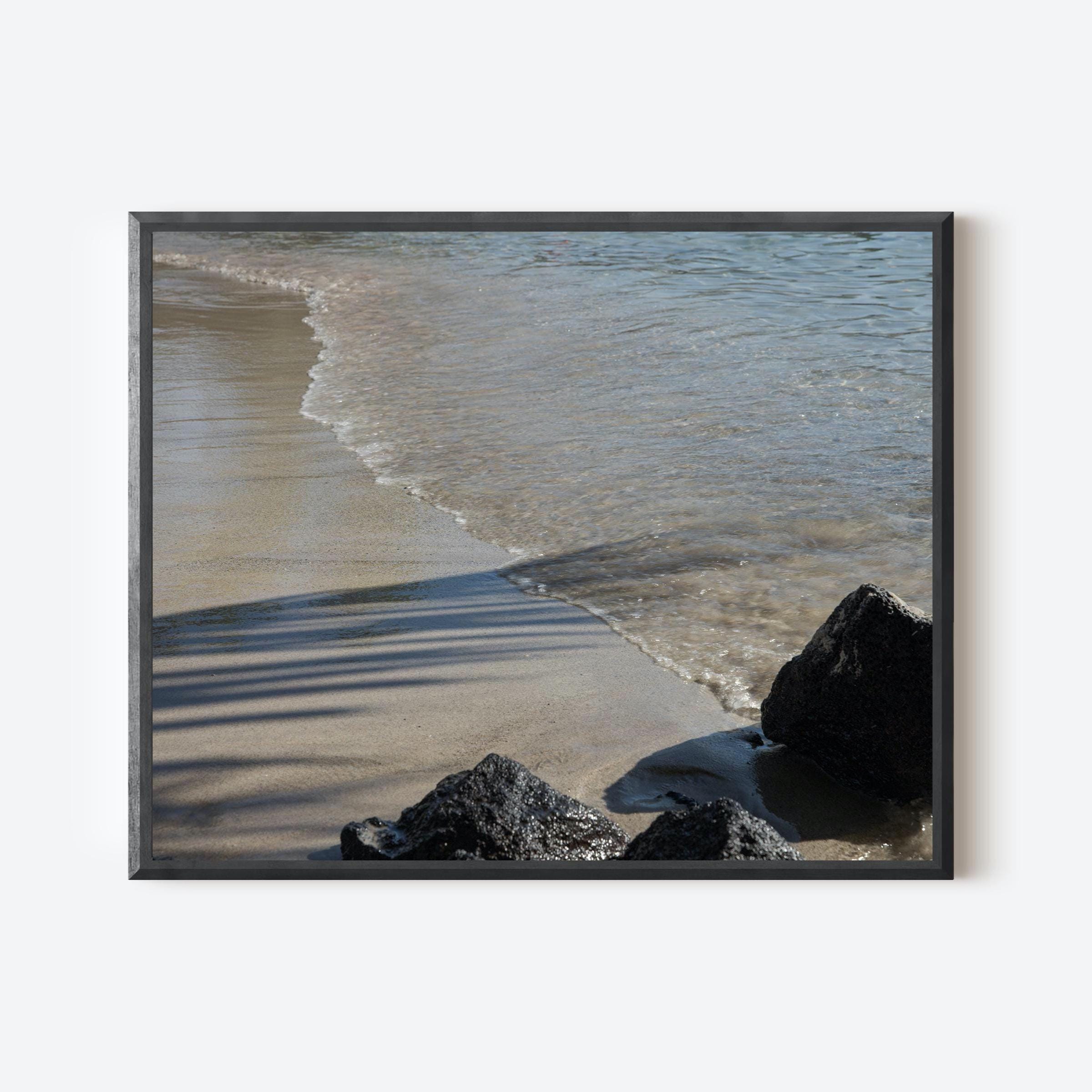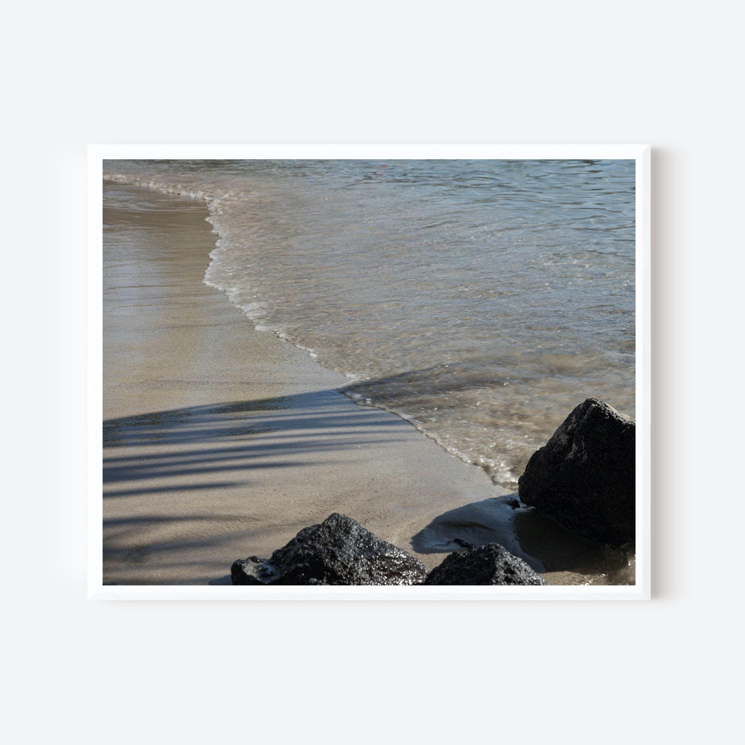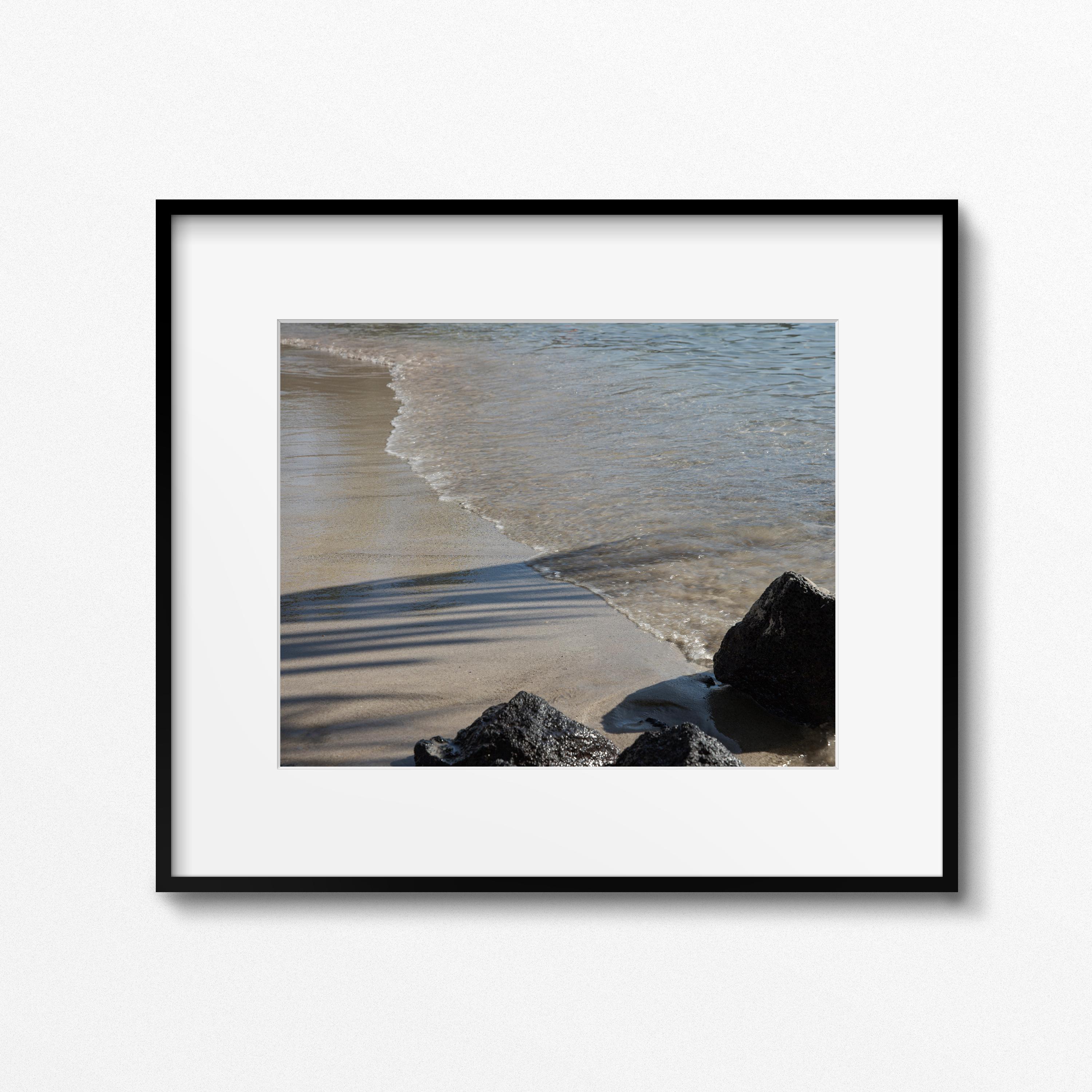 Along the Kona shoreline, the frame reduces to sand, water, shadow, and a single point of weight. A diagonal line defines the composition, with variation in tone and texture carrying the image.