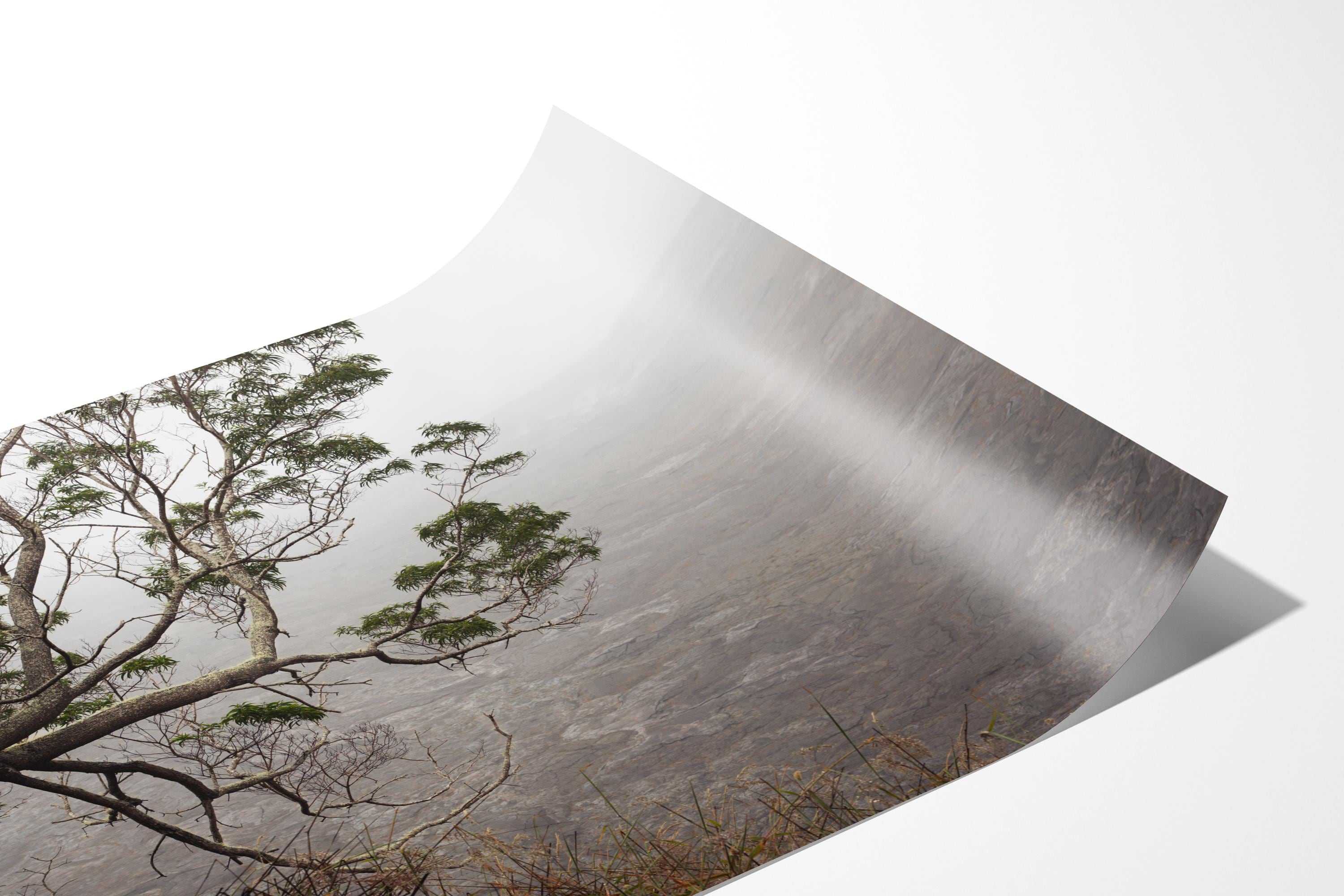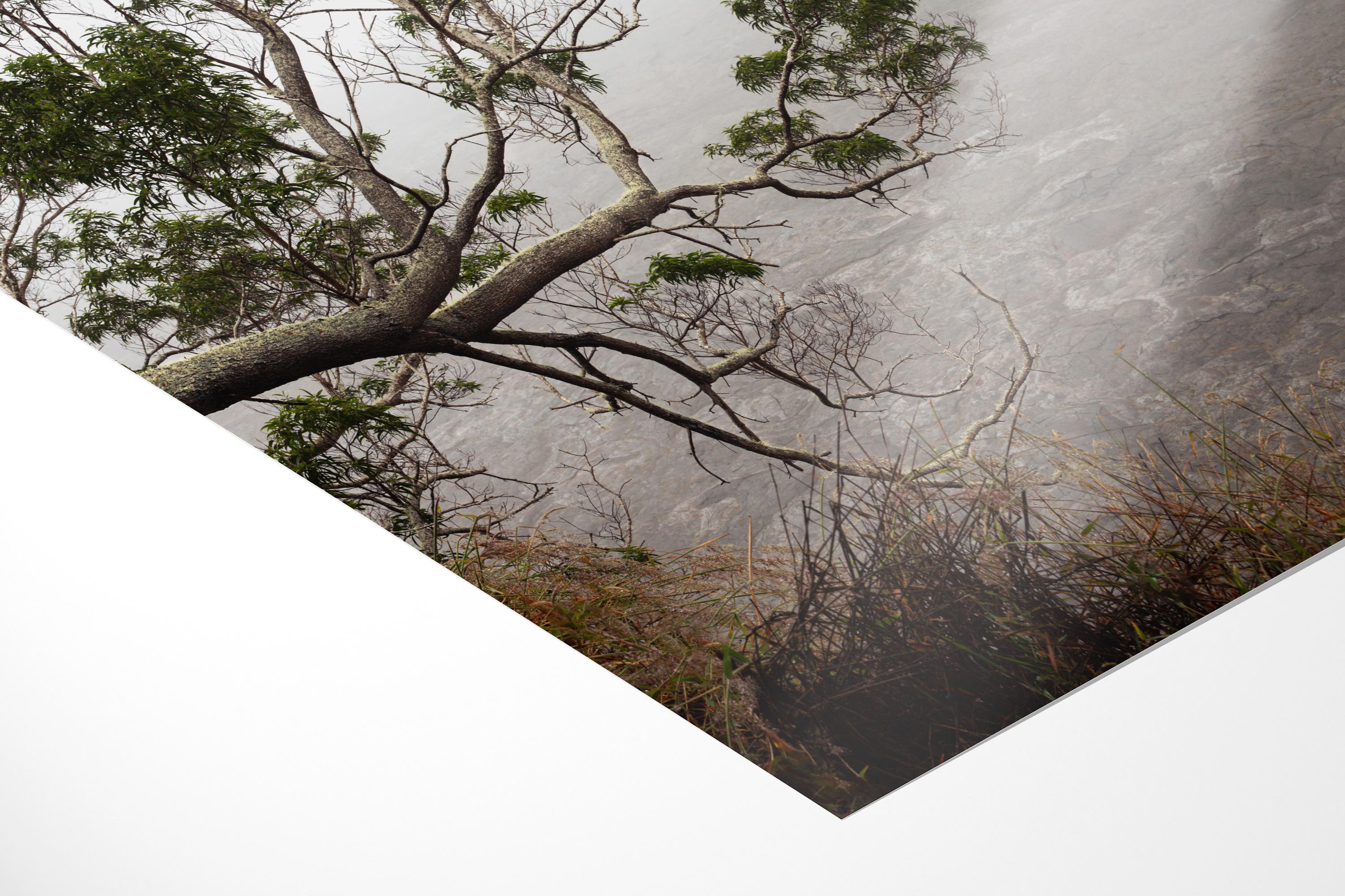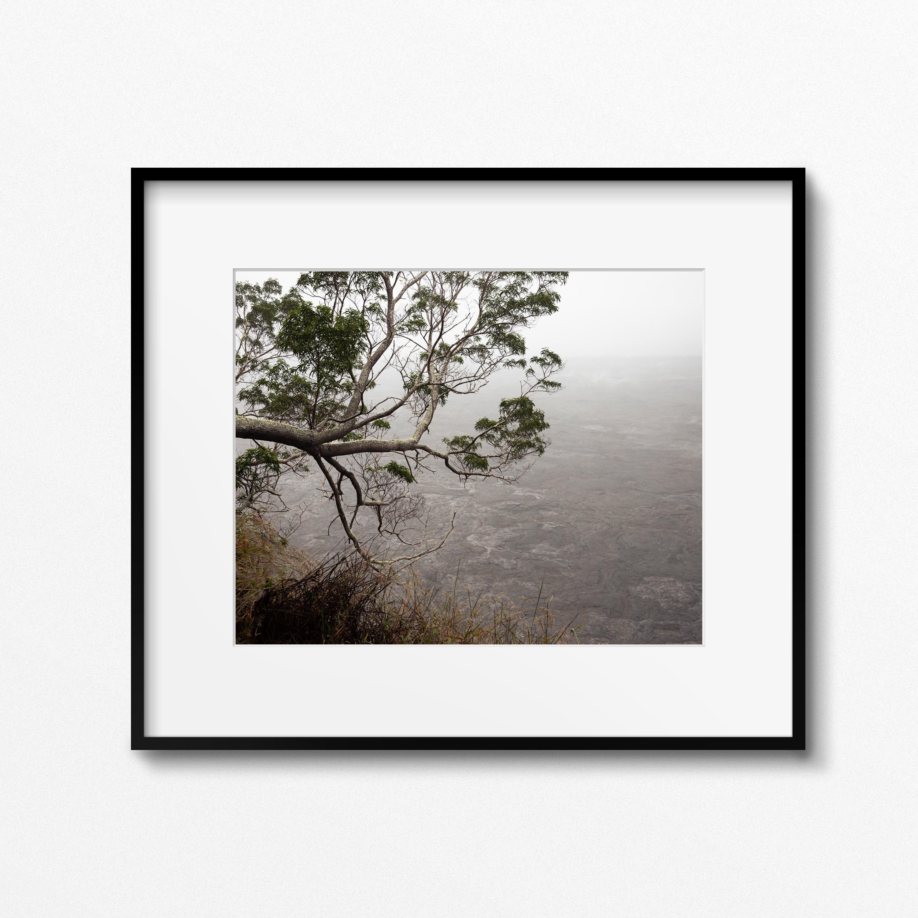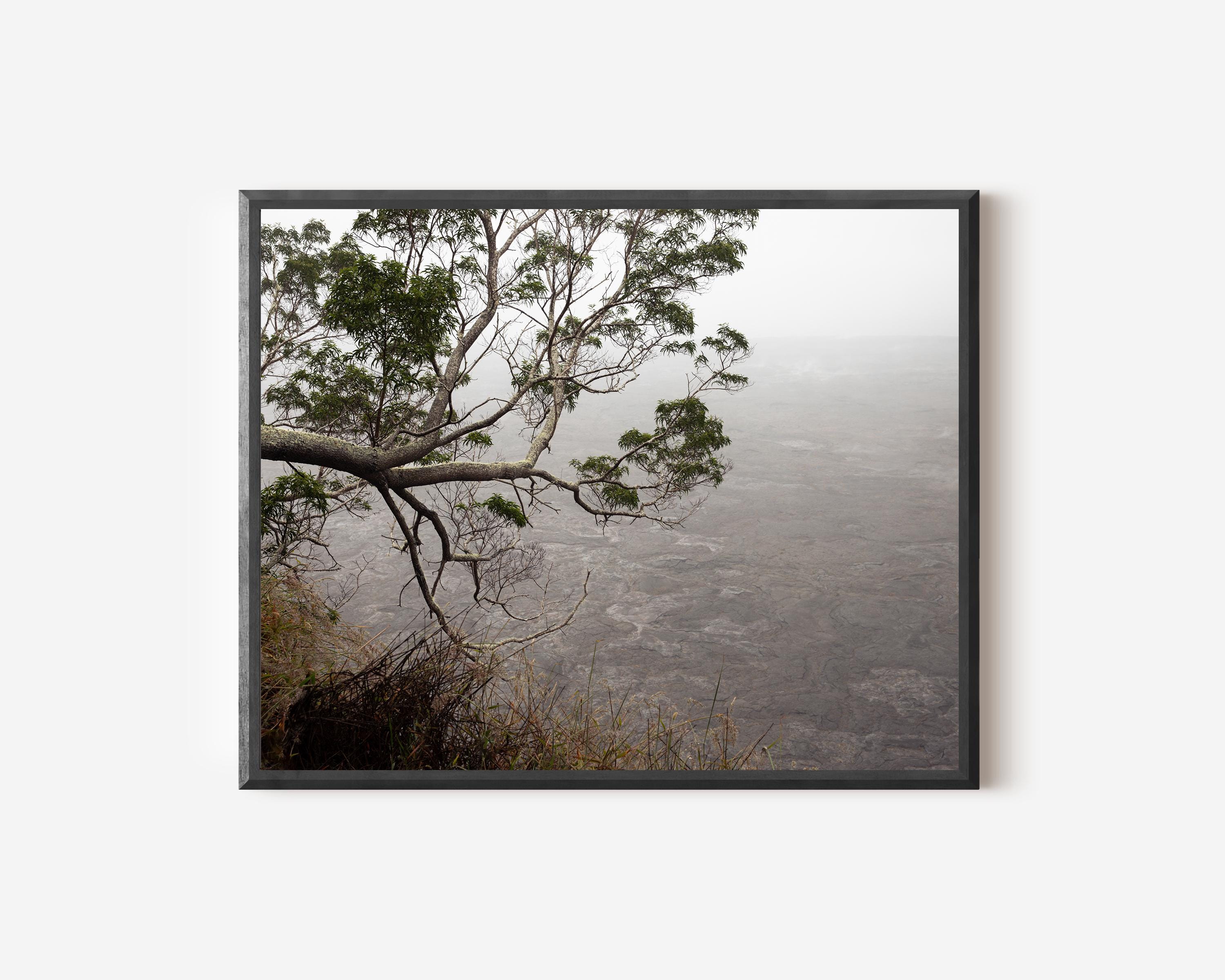 Captured in Hawaiʻi Volcanoes National Park, Hesitation explores the edge of a volcanic landscape where solid ground begins to dissolve into atmosphere. A single branch reaches outward over mist-softened lava fields, introducing a quiet tension between structure and openness.