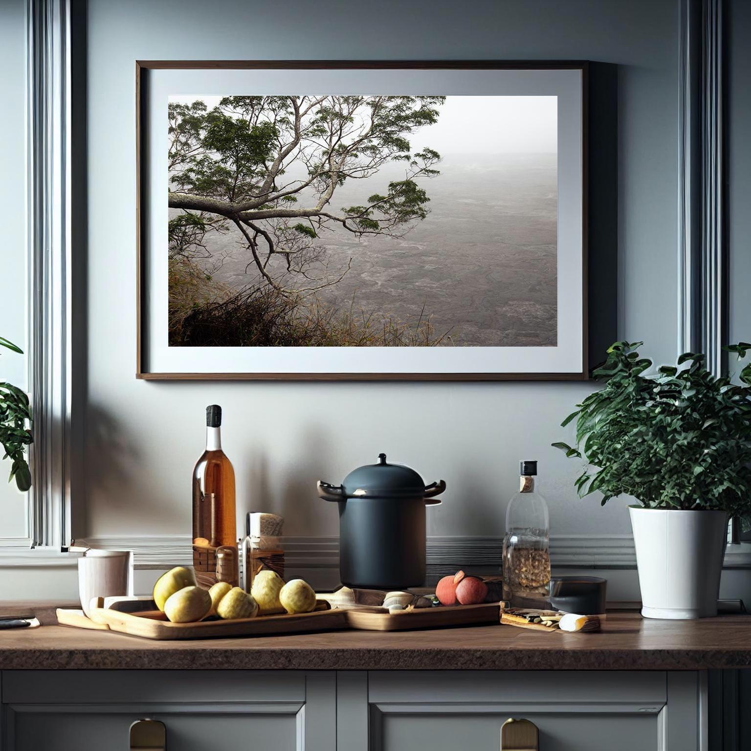 This piece is well suited for spaces that lean calm and intentional—bedrooms, studies, or living areas layered with linen, wood, and stone. The volcanic palette pairs naturally with warm whites, clay tones, and soft grays. Style it with a wide white mat and a light wood or soft black frame to emphasize the openness and quiet structure of the image.