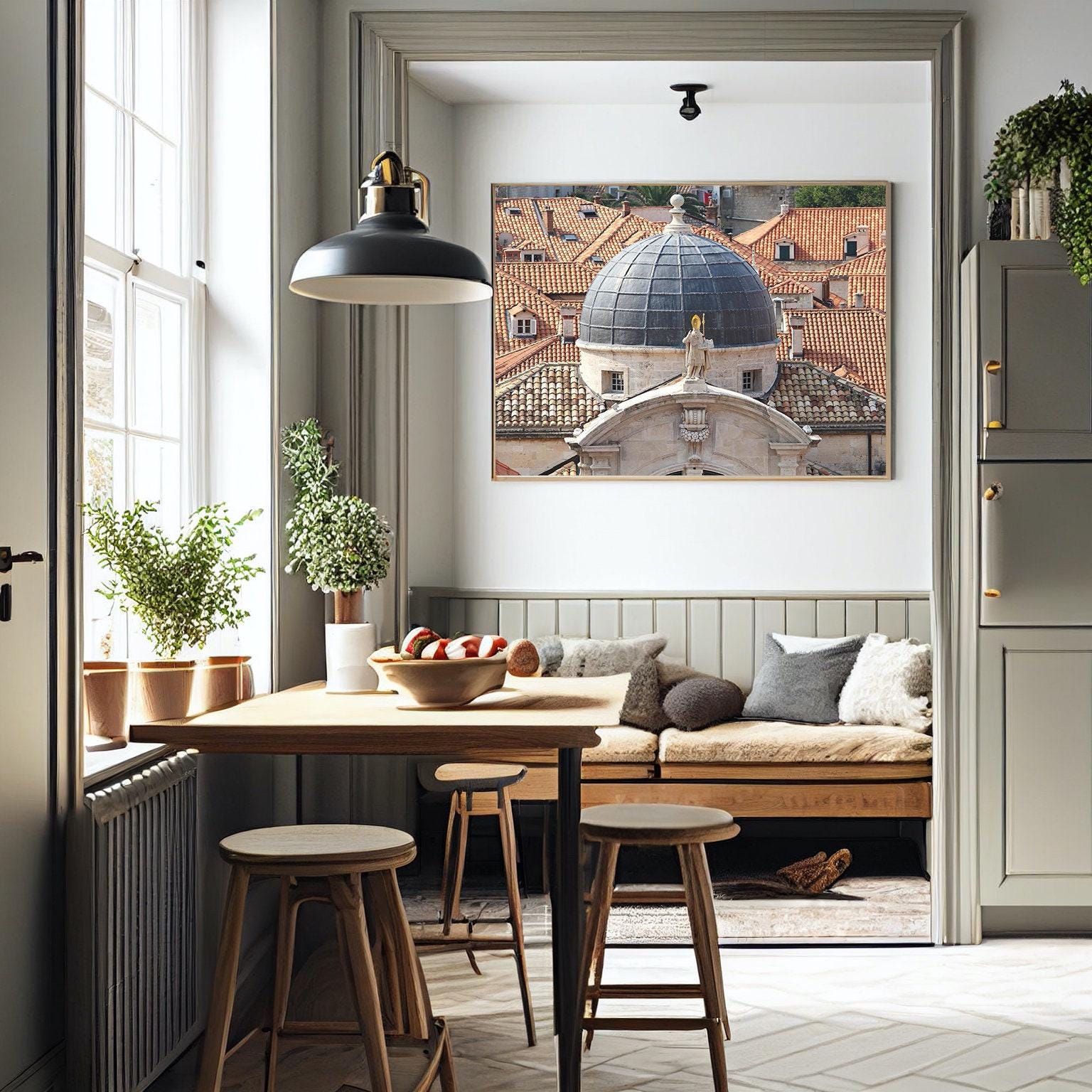 Dubrovnik Croatia photography print featuring the beautiful dome of St Blaise Church and surrounding terracotta rooftops. Viewed from the city walls, the imposing Baroque church erected in the Old Town of Dubrovnik is named for the city's patron saint. Relive your time in Dubrovnik with this traditional wall art print. Print it large to make a statement or add a ready to hang frame.