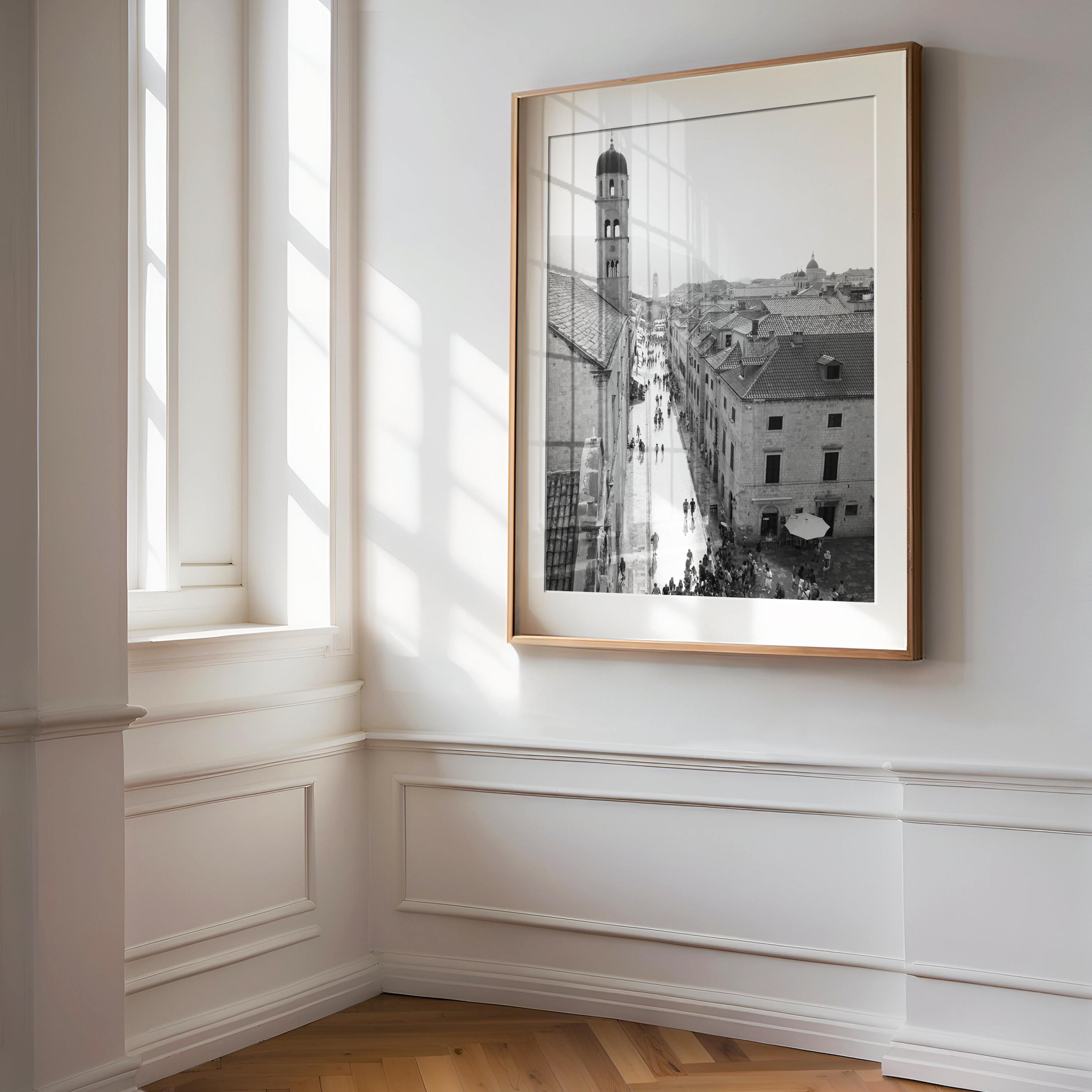 Dubrovnik’s Old Town is a UNESCO World Heritage Site, once the heart of the Republic of Ragusa, a powerful maritime city-state. The monochrome palette of this print emphasizes the historic textures, intricate stone facades, and centuries-old architecture. The contrast of light and shadow brings a timeless, almost cinematic quality, perfect for adding depth to modern or classic interiors.