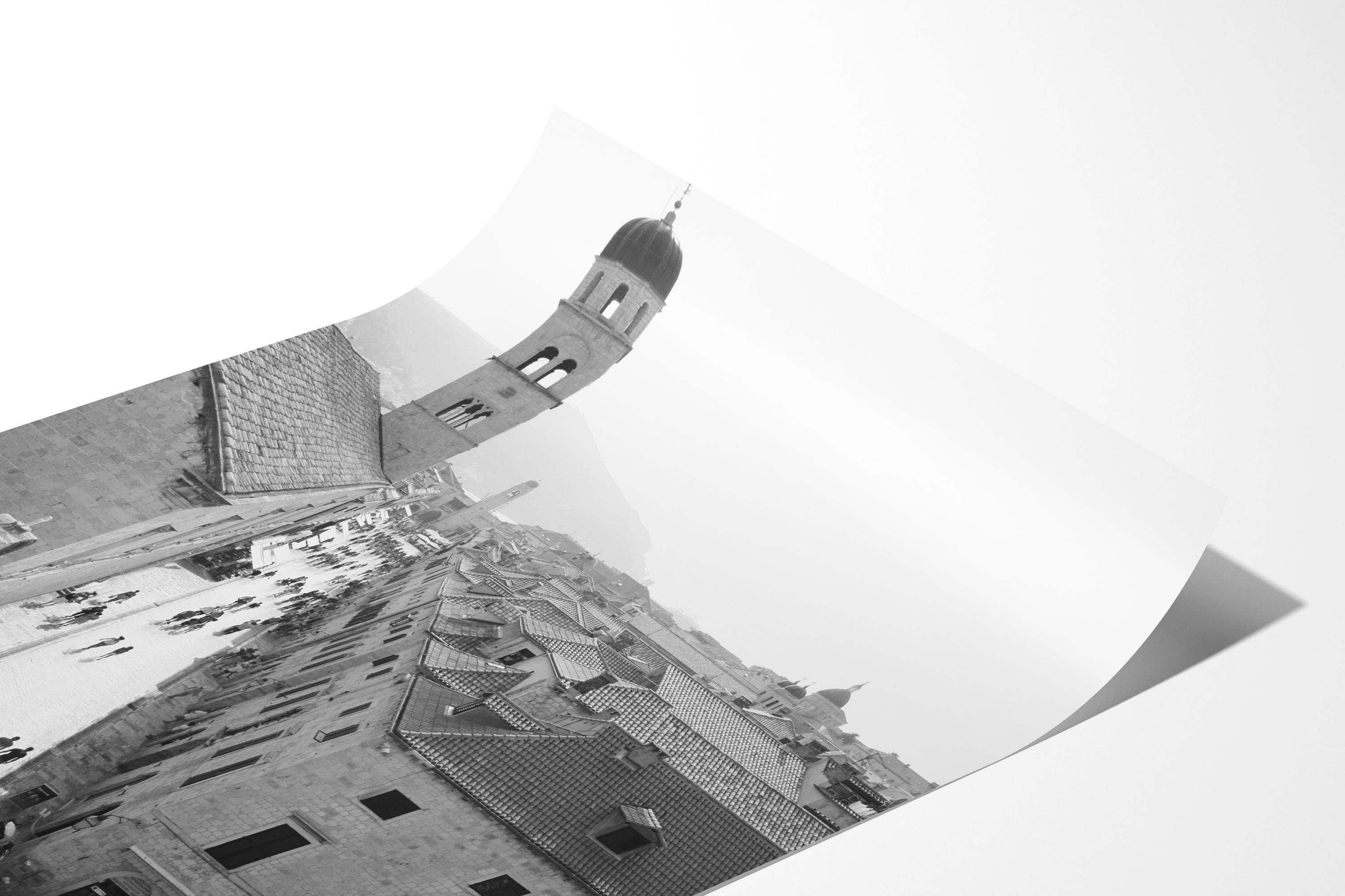 Experience the enchanting charm of Dubrovnik’s Old Town in this black and white photography print. Taken from the historic City Walls, this image overlooks the Stradun, the main thoroughfare of Dubrovnik, lined with medieval limestone buildings and filled with the energy of locals and travelers alike.