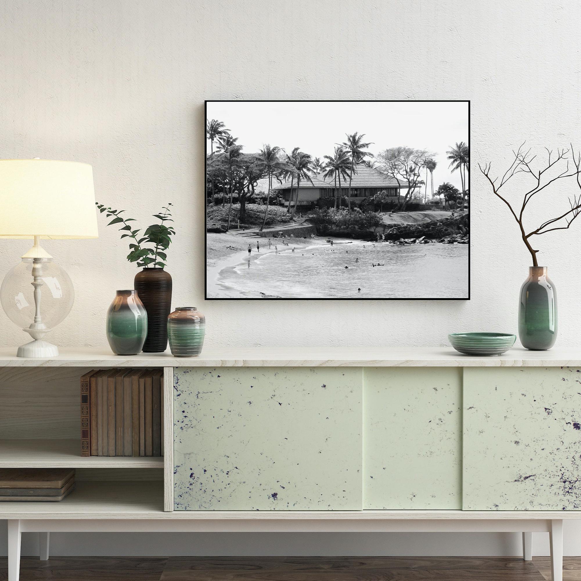 Escape to the serene shores of Hawaii with this elegant black and white beach photography print. Featuring iconic palm trees and beachgoers embracing the coastline, this vintage-inspired artwork captures the timeless charm and laid-back spirit of the Aloha State.