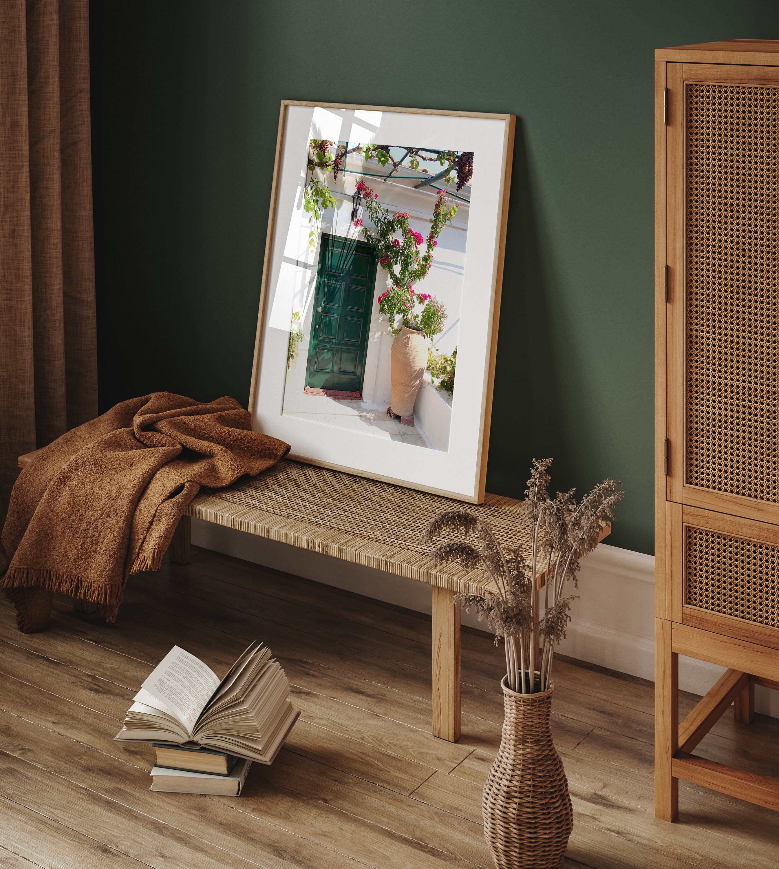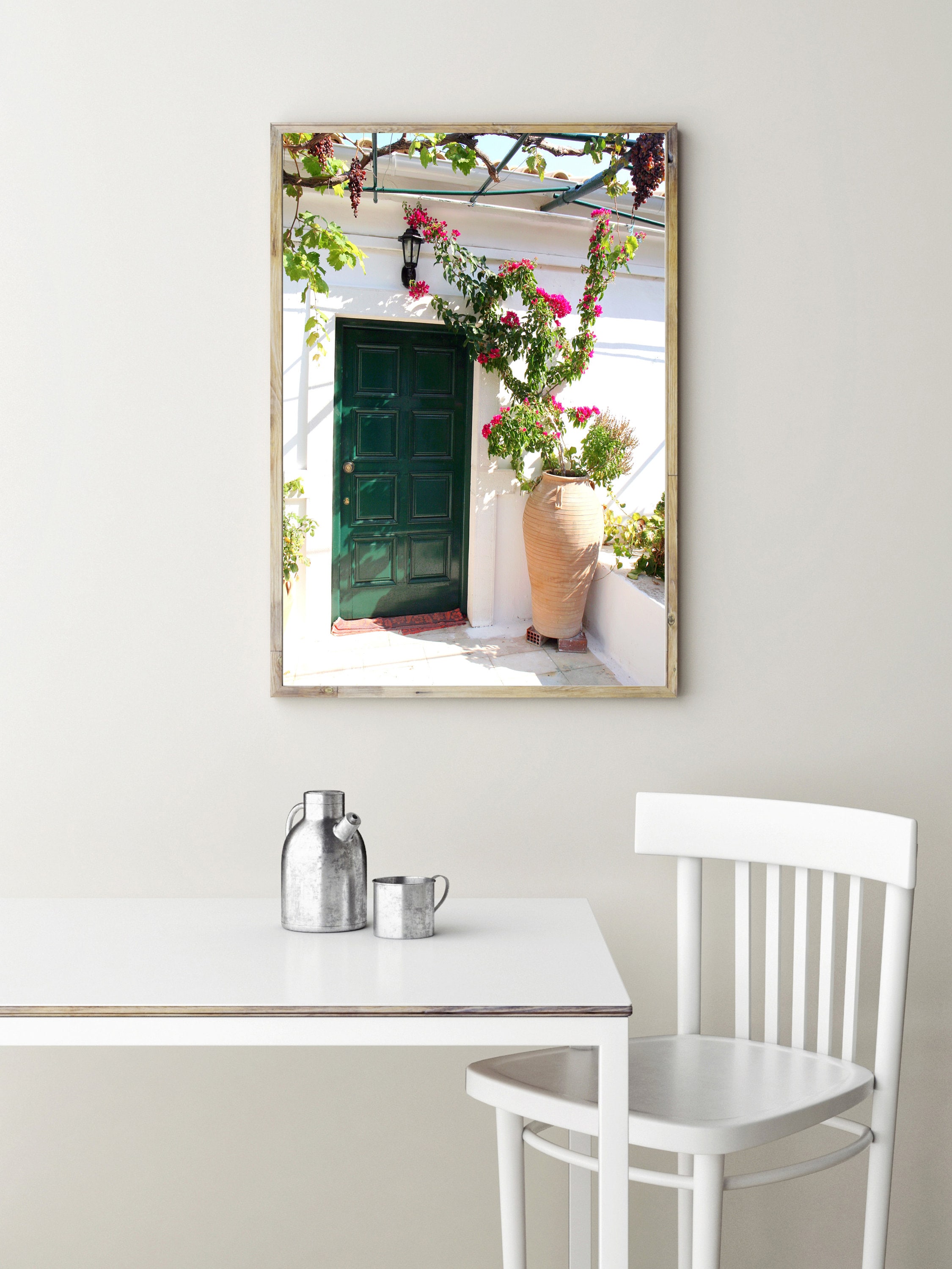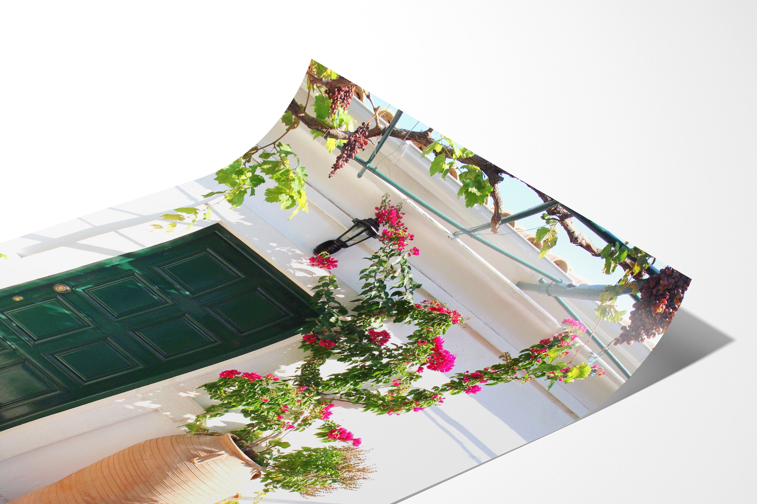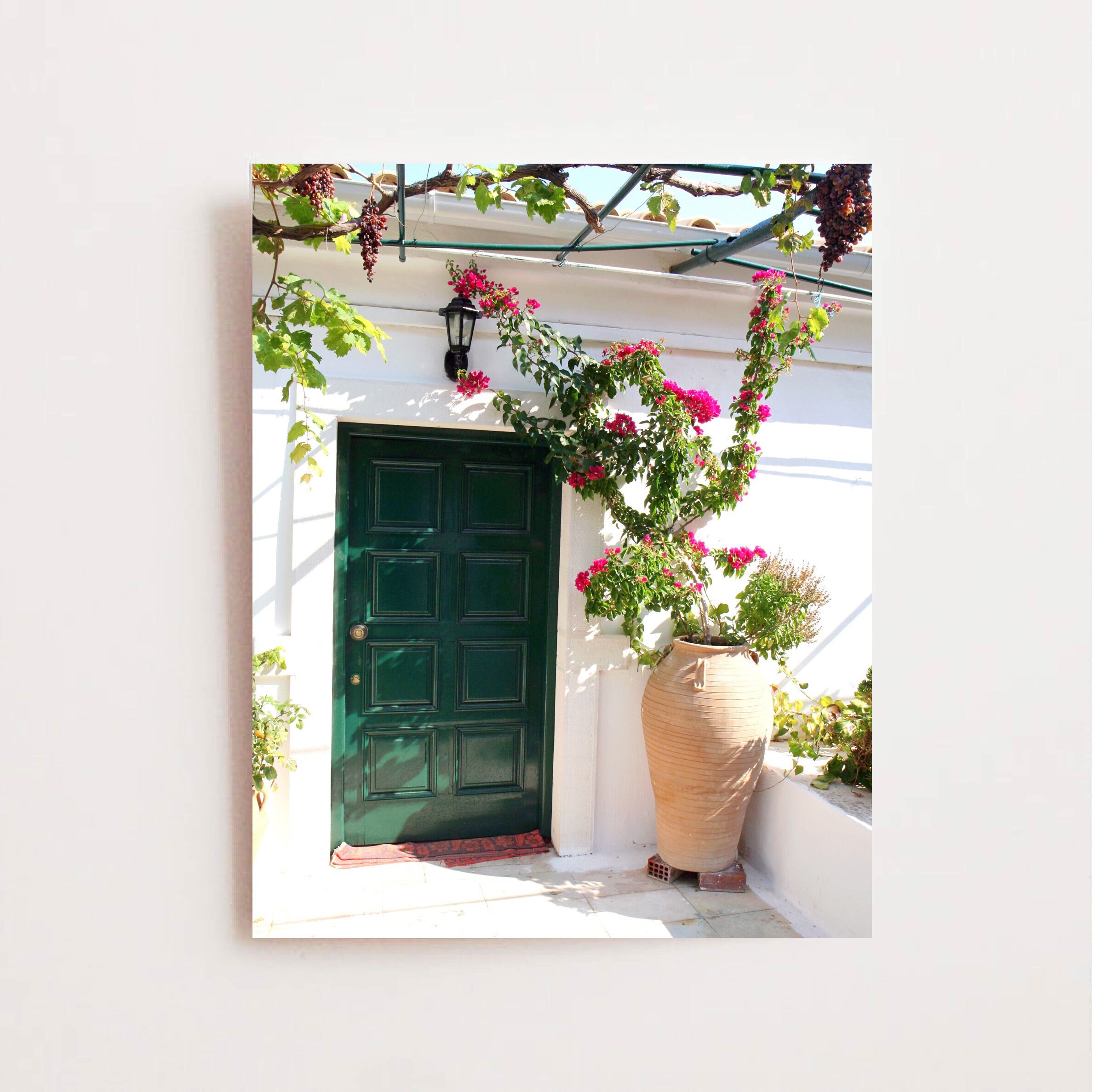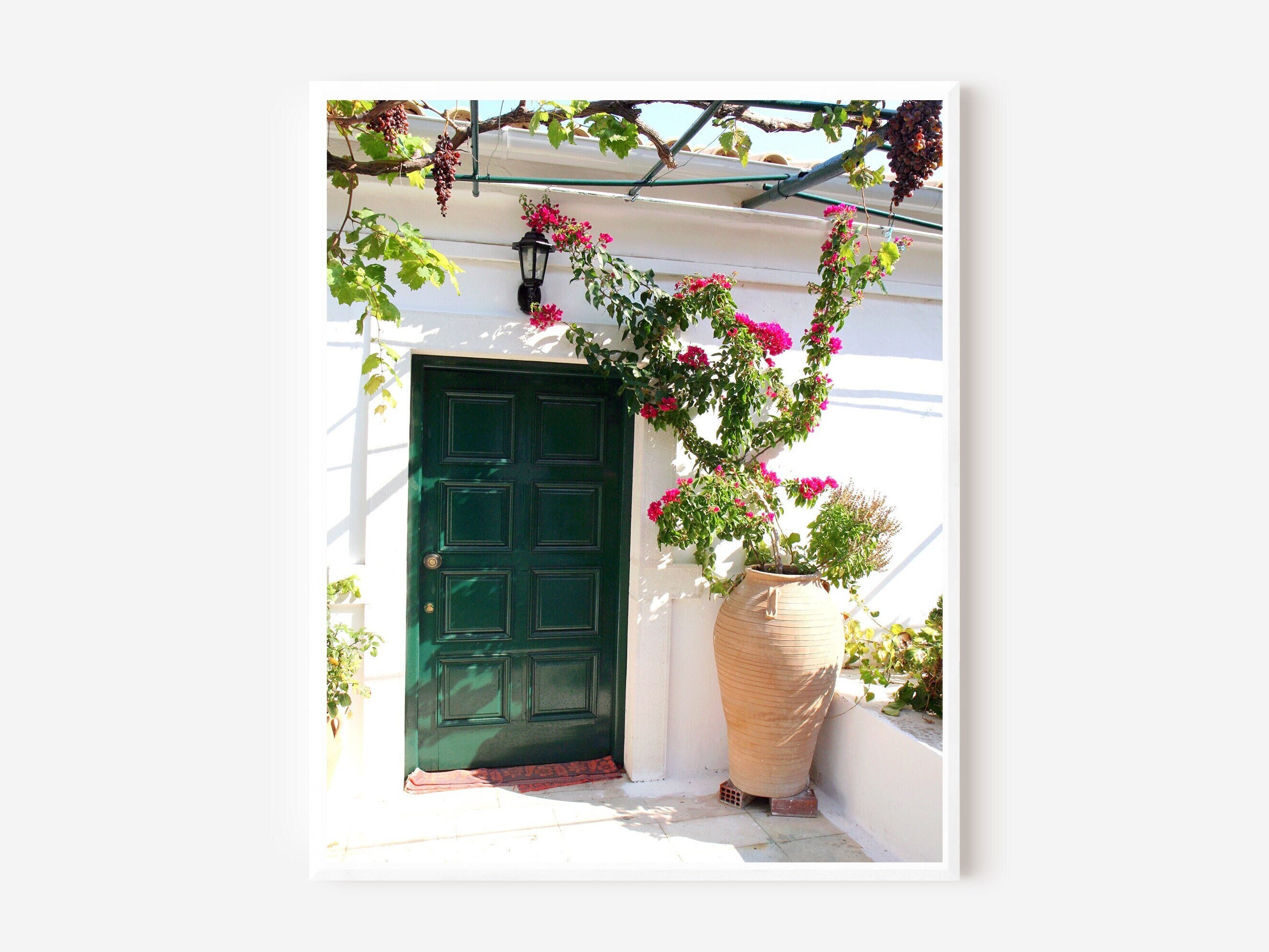 Original photography print of vibrant emerald green door from Paleokastritsa Monastery tucked in the hills of Corfu, Greece. Lushly draped in grapevines and framed by a classic greek terra-cotta pot of Bougainvillea flowers, this perfectly mediterranean print would make a great additional to your travel gallery wall or door collection. Personalize your print by adding a mat or frame!