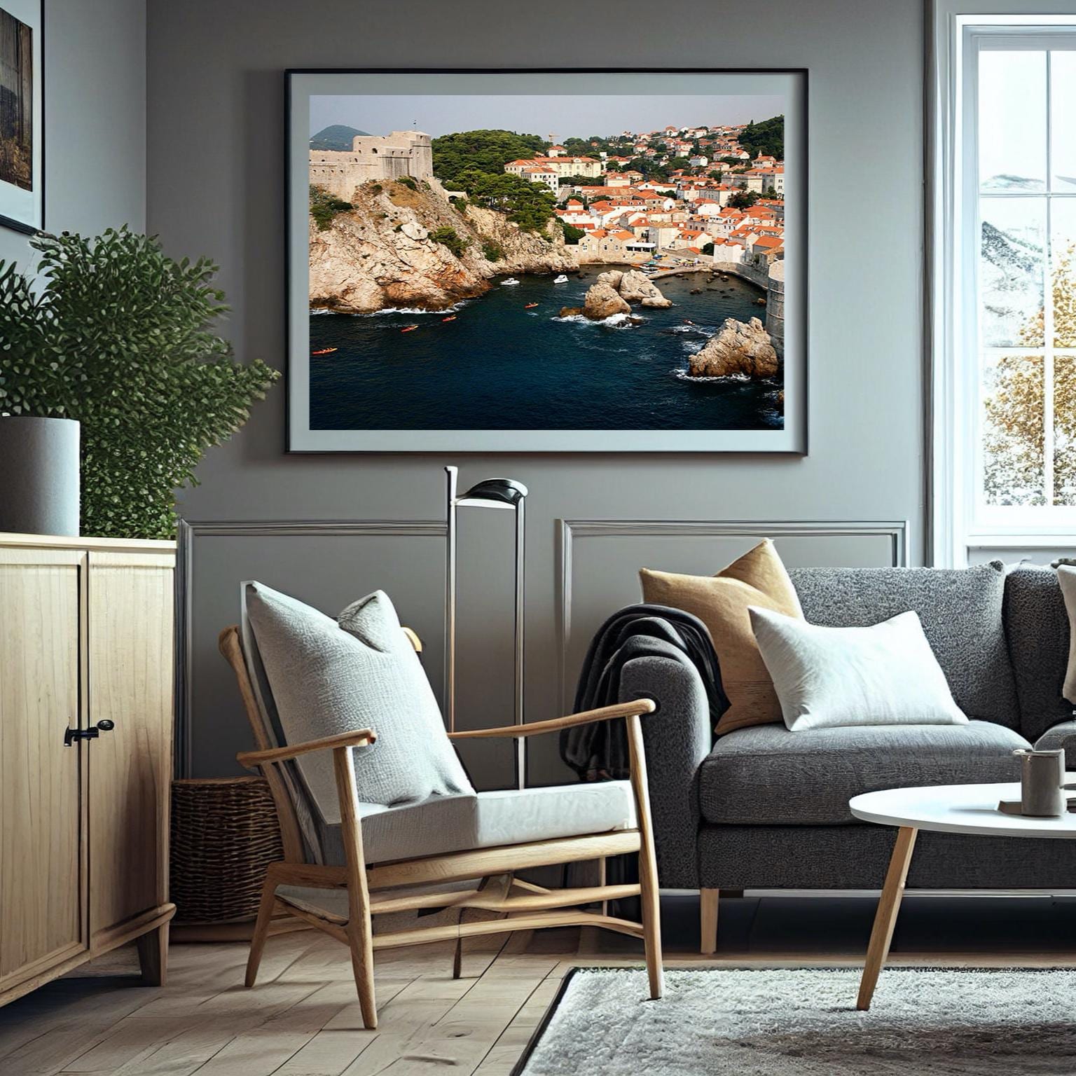 Explore stunning Dubrovnik Croatia by the Adriatic Sea with this bold and unique travel photography print for your home or office walls. One must view the old St Lawrence fortress, cliffs and beaches of Dubrovnik from the top of the old city walls. Deep navy and teal water contrasts the lightness of the buildings and coral rooftops. Kayaks navigate the waters around the dramatic rocky coastline. Add this print to your travel gallery wall or print it large to make a unique statement.