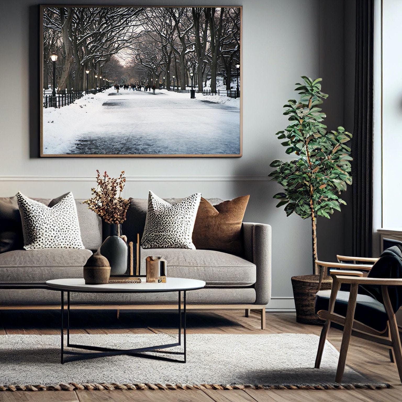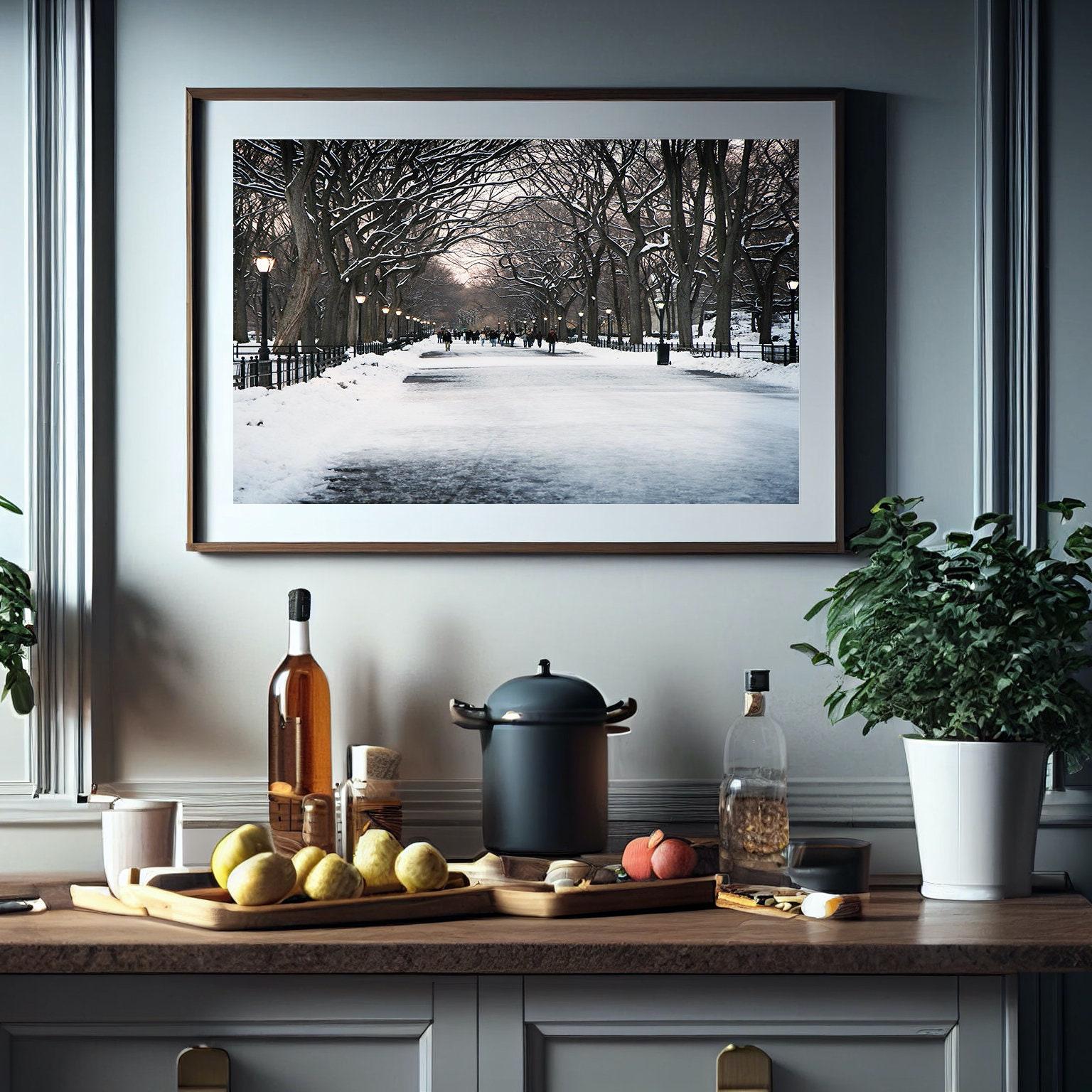 New York City photography print from Central Parks Literary Walk Promenade on an early snowy evening in December. Ice covered American Elm Trees, glowing street lamps and bundled people walking. Winter romance and cozy wall art for your home. Photography by Vita Nostra. Personalize your print by adding a mat or a frame!