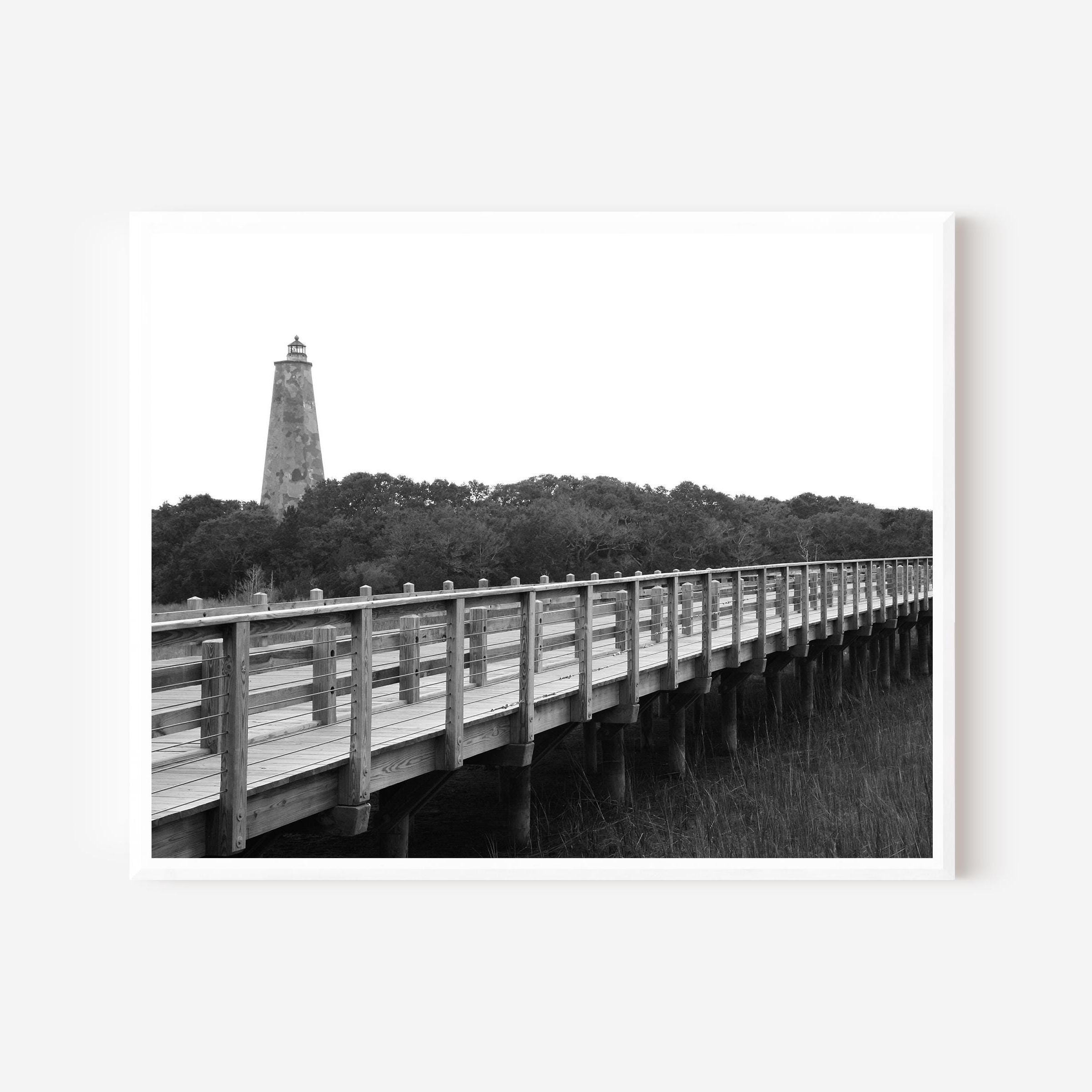 This black and white photograph features the iconic Old Baldy Lighthouse rising beyond a wooden boardwalk on Bald Head Island, North Carolina. The composition focuses on line, repetition, and negative space, allowing the landscape and structure to feel calm and deliberate.